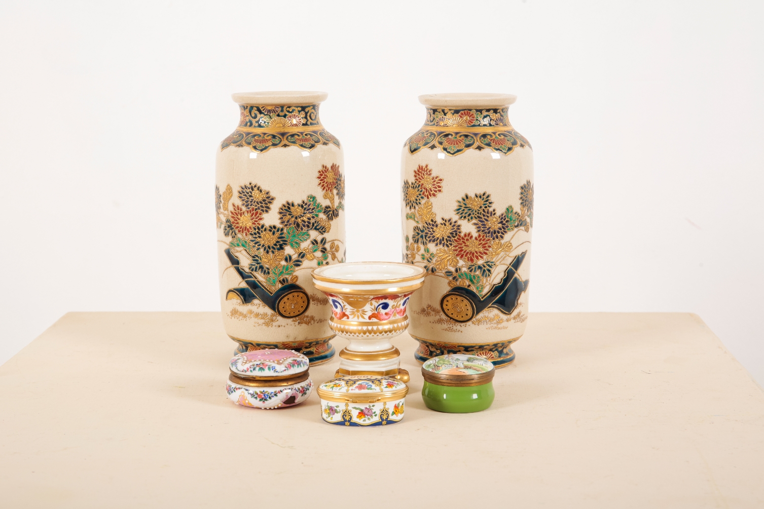 20th century, decorated with blooming foliage, 19cm high; together with a Derby potpourri; and three enamel patch boxes (7)