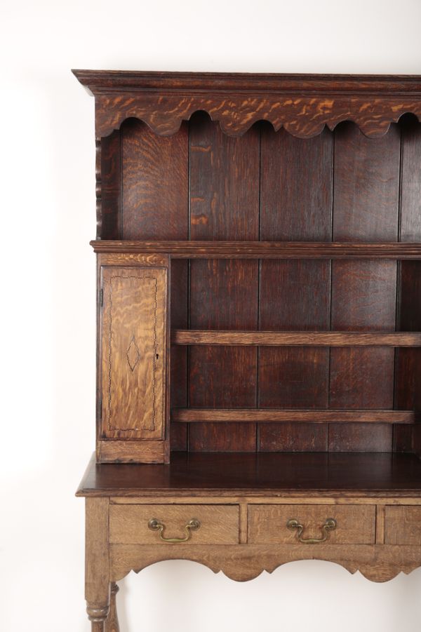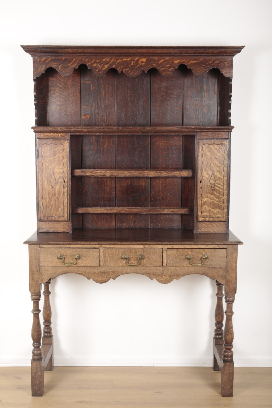 the upper portion 19th century, the moulded cornice above three shelves and two flanking cupboard doors, the lower portion 20th century, three frieze drawers over a shaped apron and turned legs, 200cm high x 128cm wide x 45cm deep