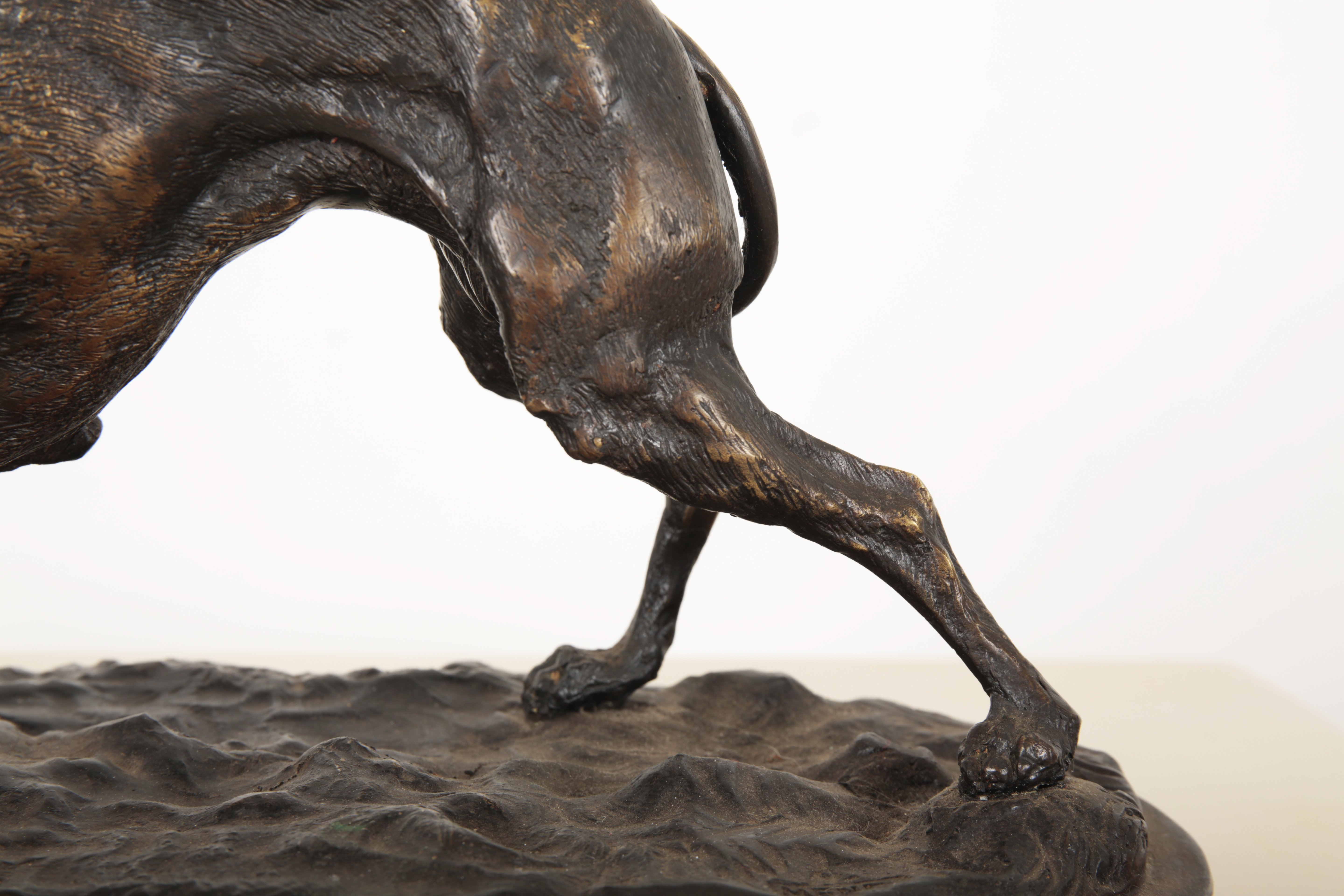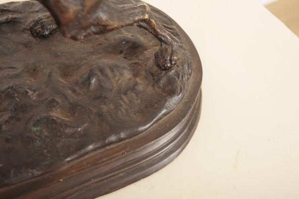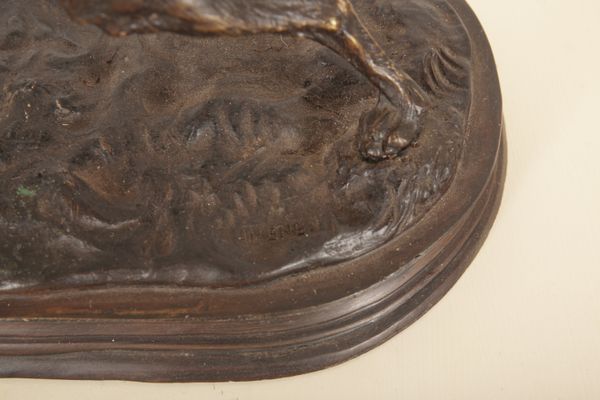 signed 'MENE', the patinated bronze dog realistically modelled, posed with slicked back ears, raised on stepped oval plinth 20cm high x 30cm wide x 17cm deep