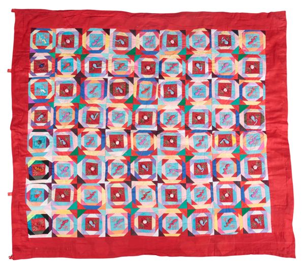 the red-ground to one side, a chequerboard of squares with four roundels amidst Chinese inspired dragons and pandas, the reverse with raised embroidered snakes, insects and crabs, 150cm x 137cm