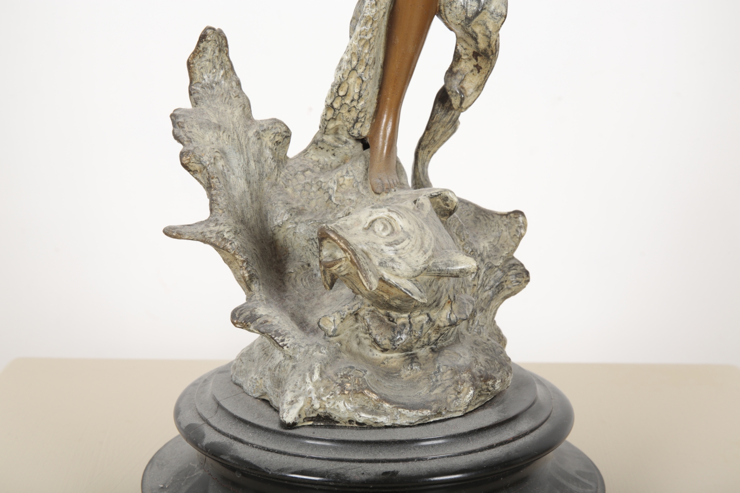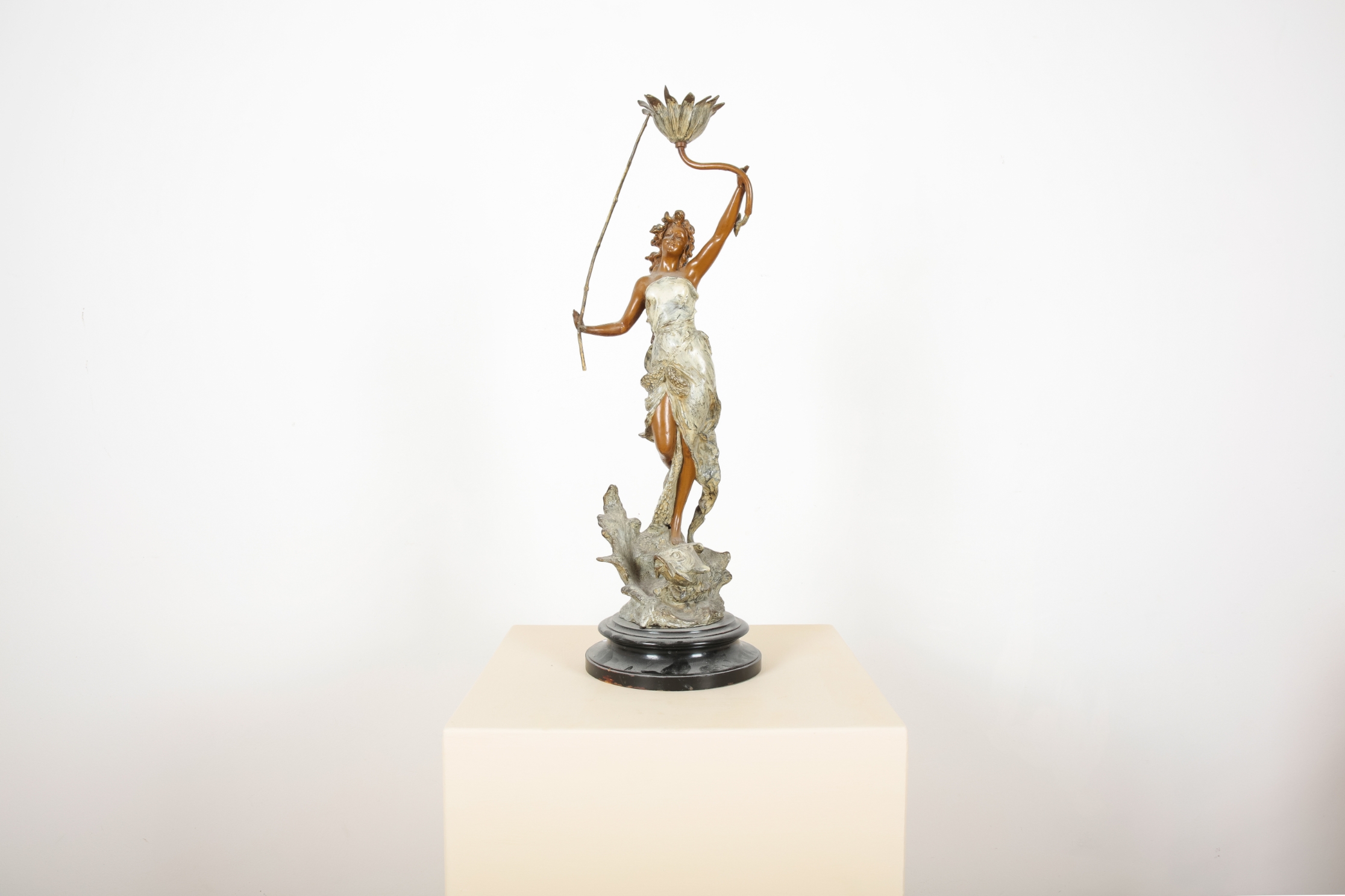 the naiad holding a water lily aloft, posed on a coral reef with a fish at her feet, 73cm high x 23cm diameter (including round wood base)
