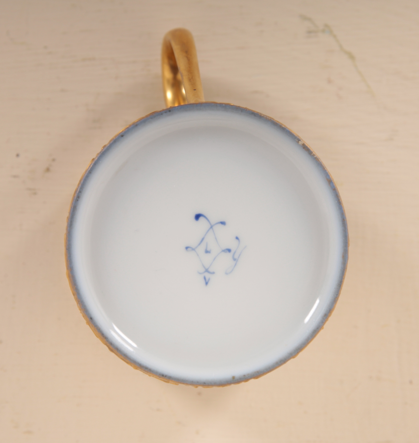 likely 19th century, the cup with interlaced L mark enclosing a letter 'L', the saucer with mark enclosing a letter 'd', both decorated with two cherubs within a gilt clad cartouche on a royal blue ground, the cup measuring 7cm high x 6.5cm diameter, and the saucer 13cm diameter (2)