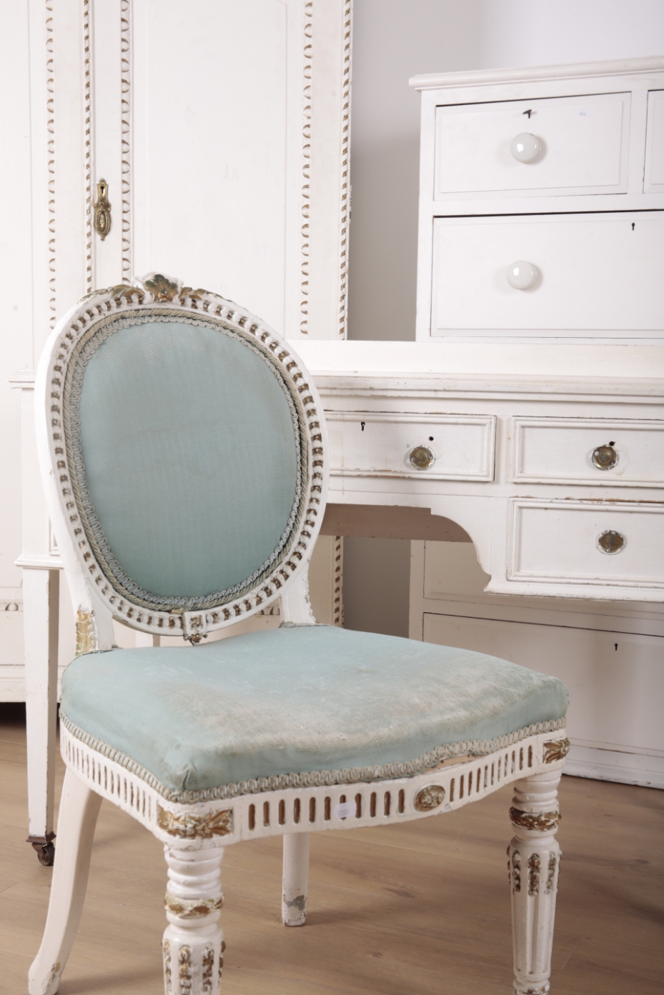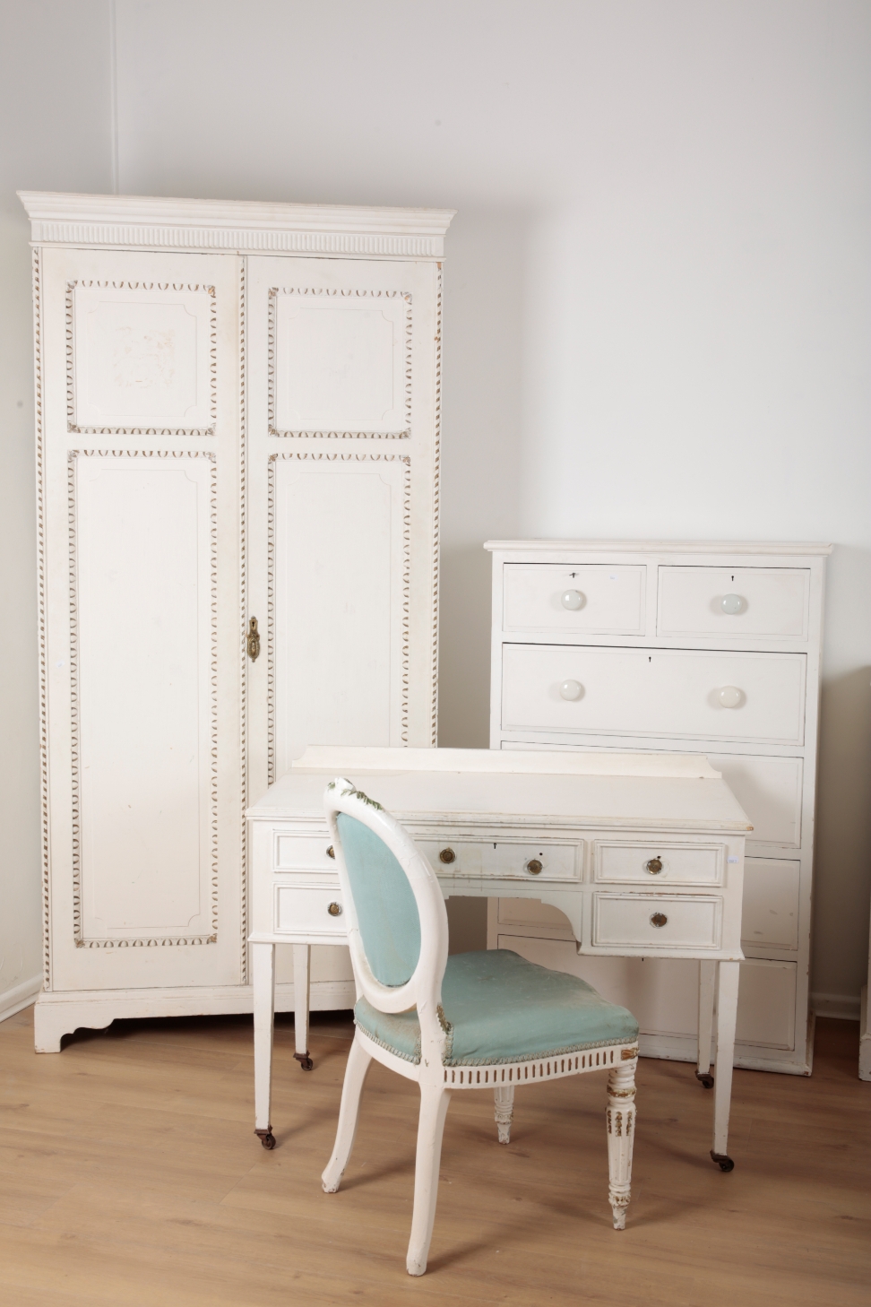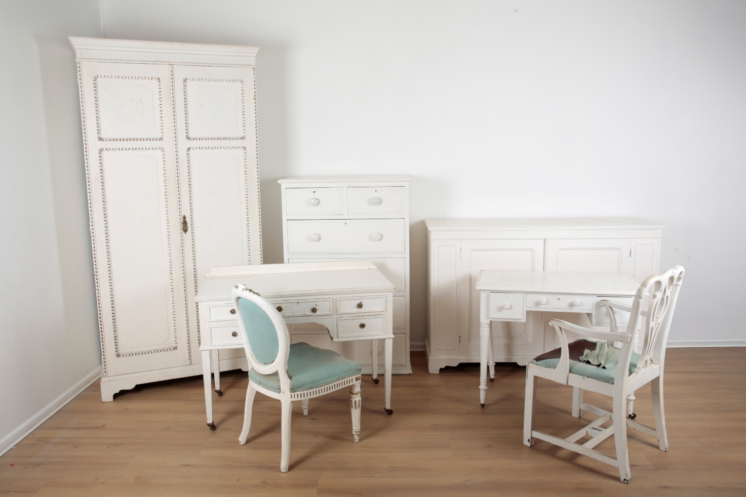 including a two door wardrobe, 195cm high x 107.5cm wide x 55cm deep, two white painted dressing tables, a chest of drawers, two chairs, and a white painted sideboard with two doors and shaped bracket feet (7)