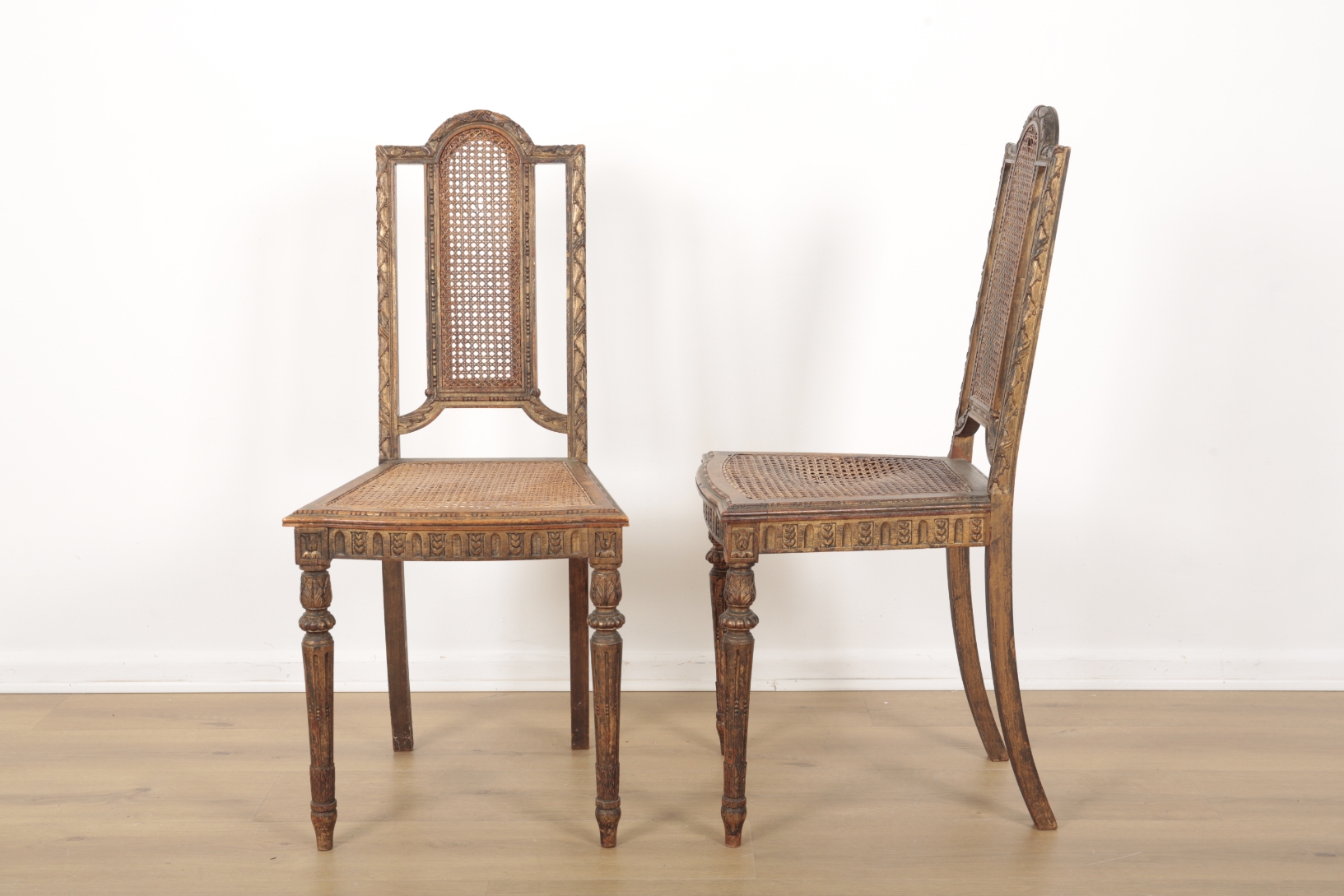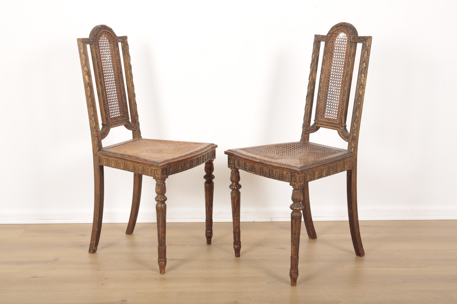A PAIR OF PARCEL GILT AND CANED OCCASIONAL CHAIRS IN LOUIS XVI STYLE