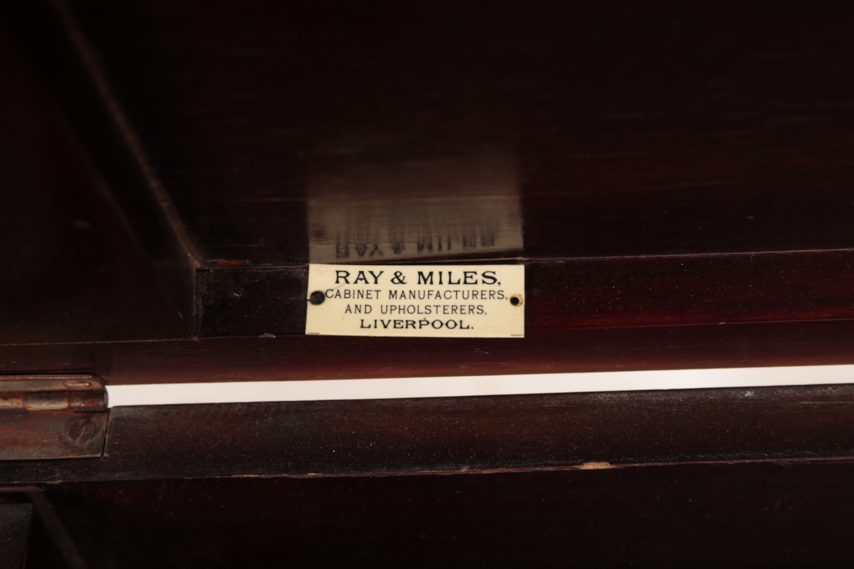 by Ray & Miles of Liverpool, with twin turned handles, rose dralon upholstered lifting seat on ring turned legs, 62cm high x 102cm wide x 34cm deep, maker’s plaque internally