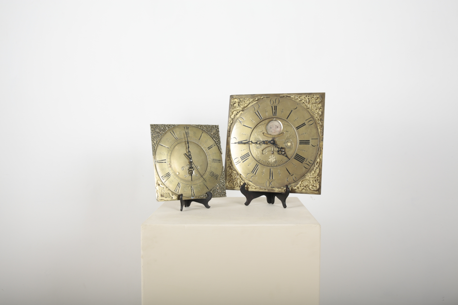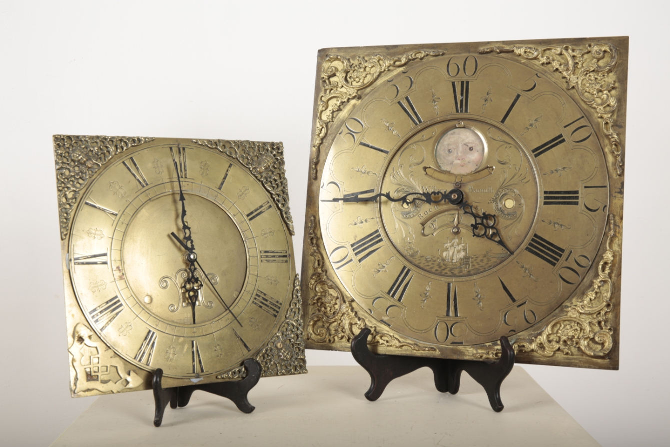 with engraved dial including a ship at sea and an aperture with painted moon face, with pierced appliques to the corners and with later quartz movements to the back; together with another similar, the larger of the two 34cm x 34cm (2)