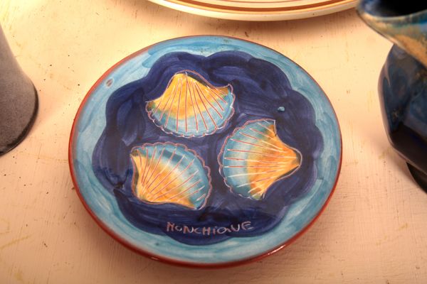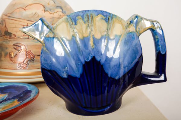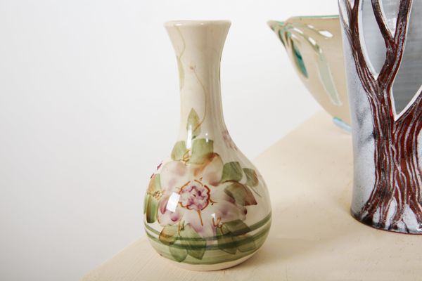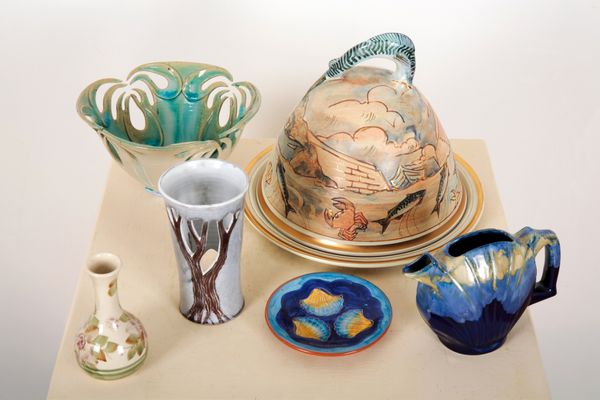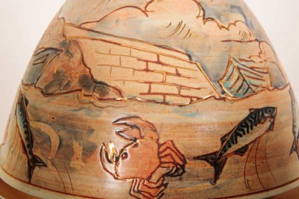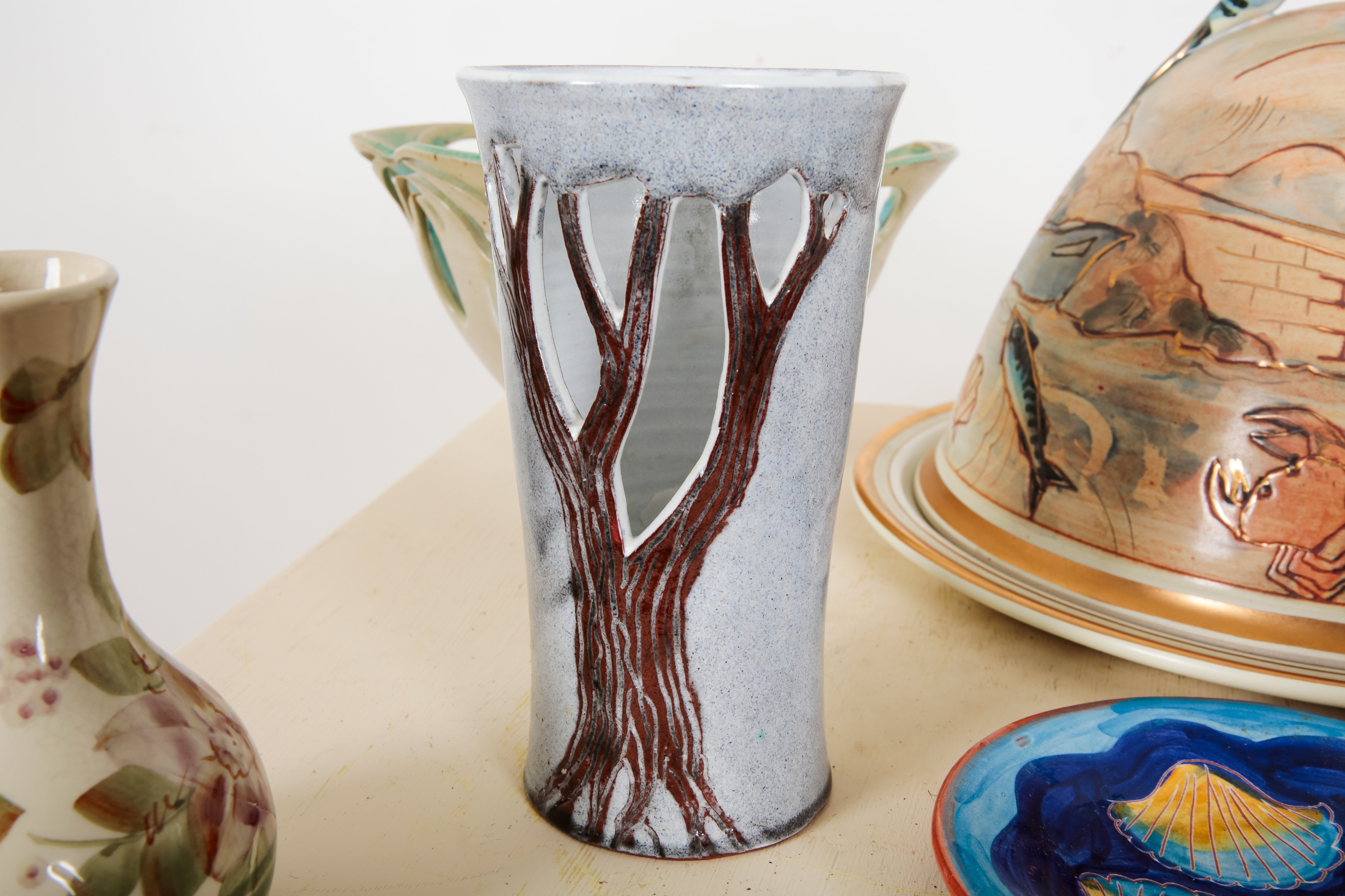 the cover with looped fish handle and incised scene, 24cm high x 30cm diameter; together with a Jill Ptyke pottery cylindrical vase; a Studio pottery pierced bowl; and three other decorative ceramic items (6)
