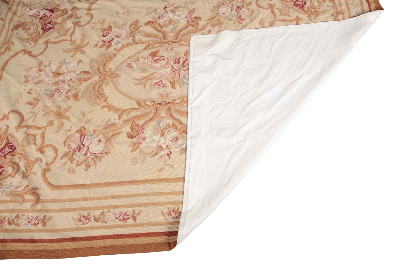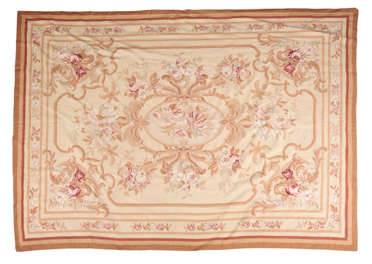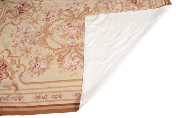 woven with pink roses, oval medallion and spandrels on a tan ground, 260cm x 185cm