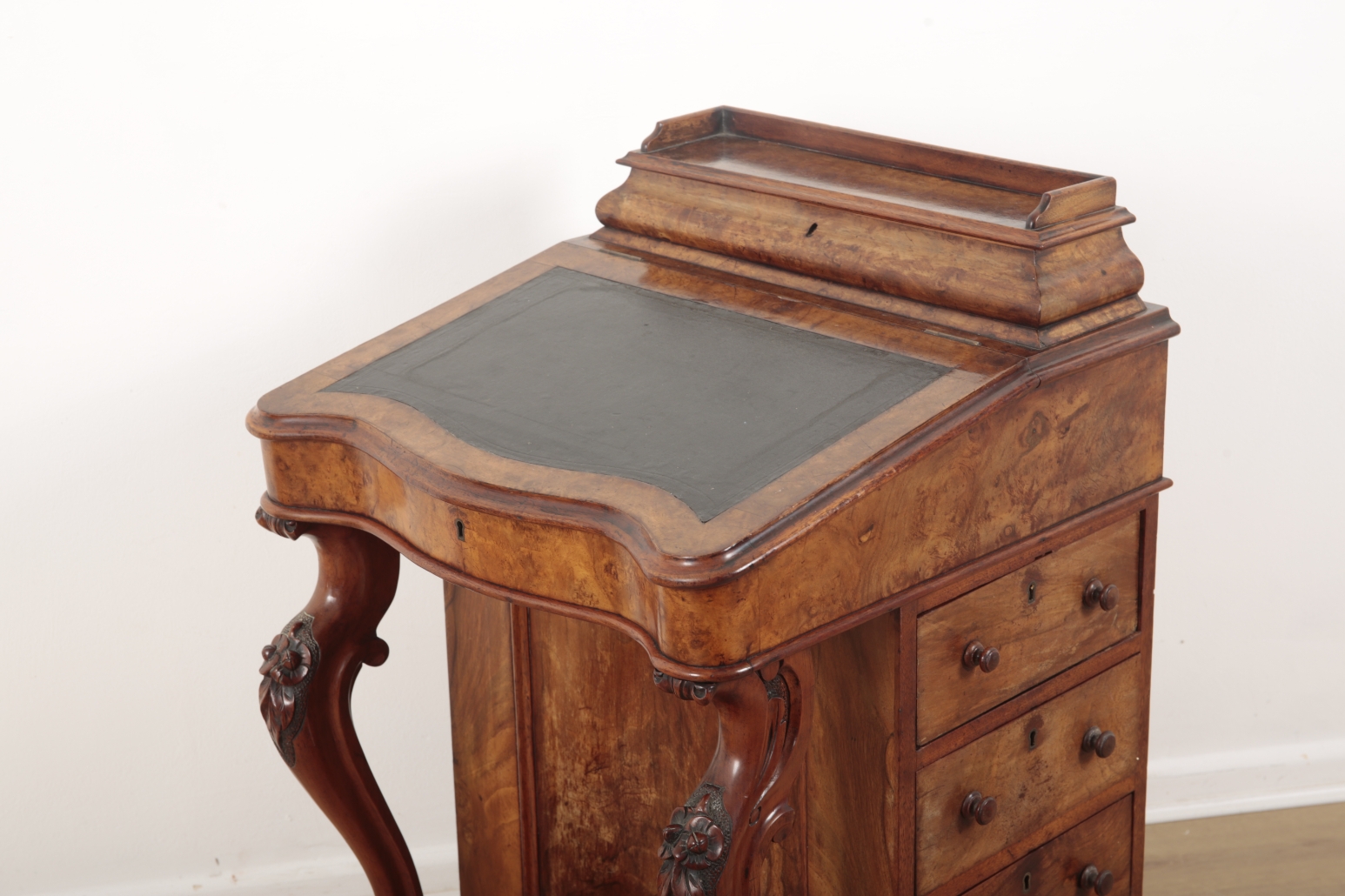 with tooled leather top to the serpentine shaped front, supported by carved scrolled legs, terminating on bun feet, 85cm high x 58cm wide x 55cm deep