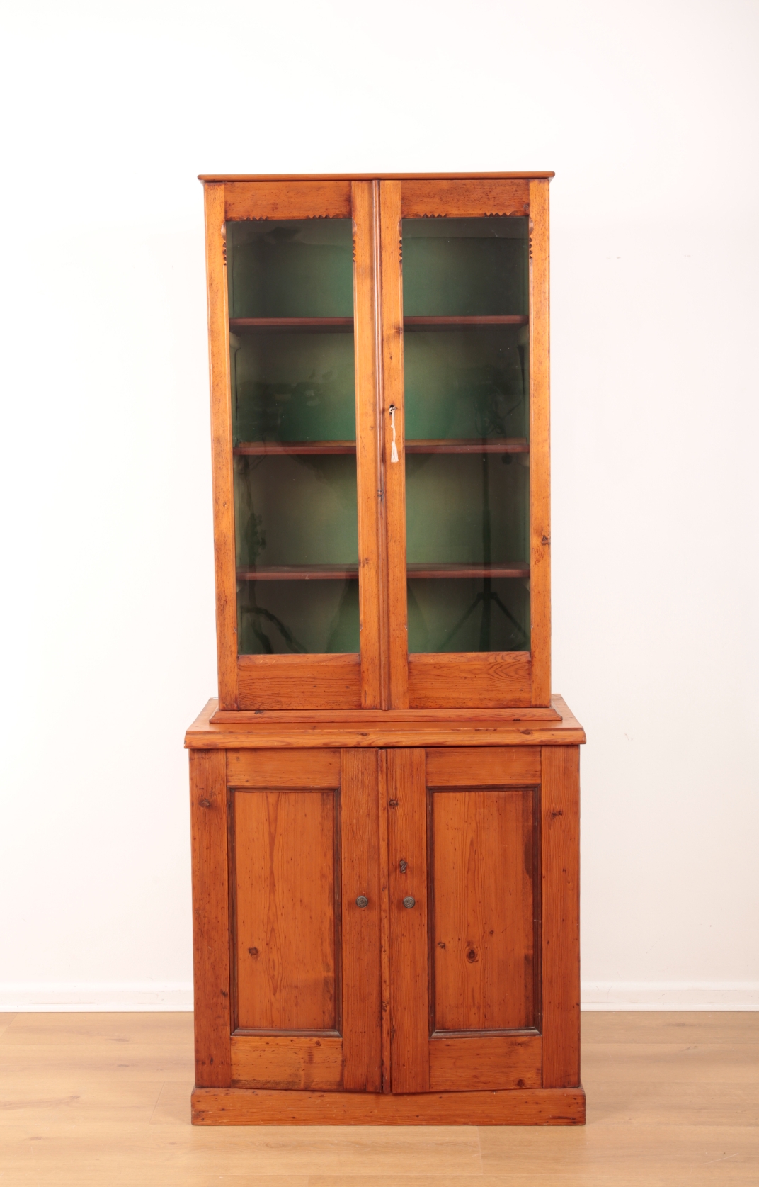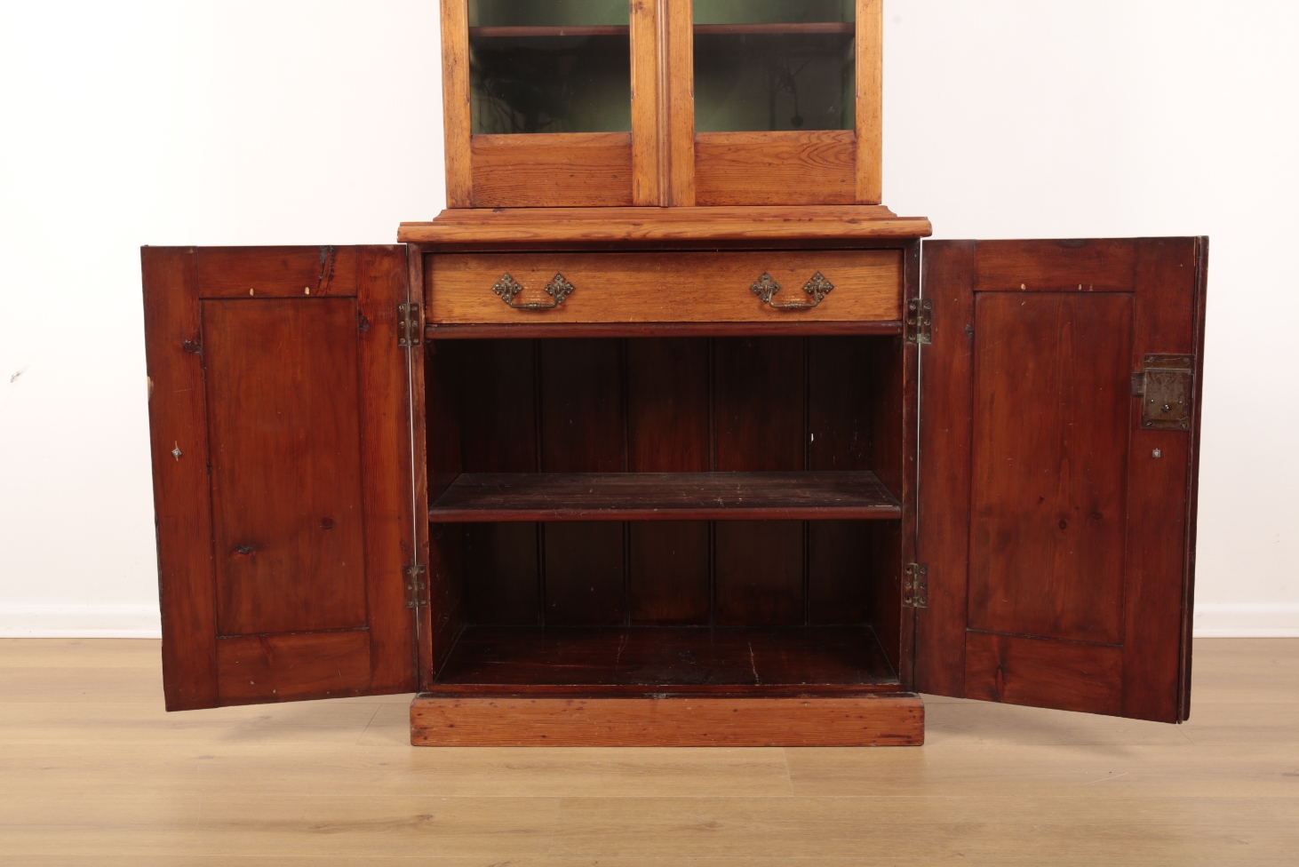 late 19th/early 20th century, with incised decoration, the two glazed doors before three shelves, the lower section with moulded top above two panelled doors, opening to one long drawer with Gothic brass handles, above one shelf, terminating on plinth, 184cm high x 77.5cm wide x 41cm deep