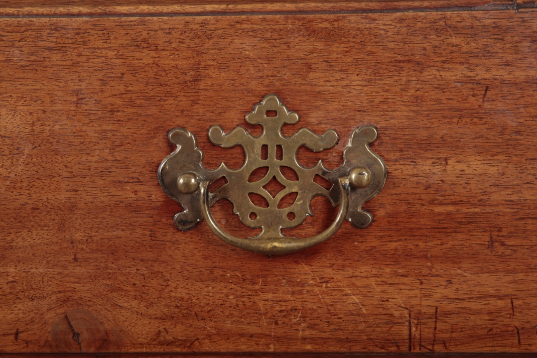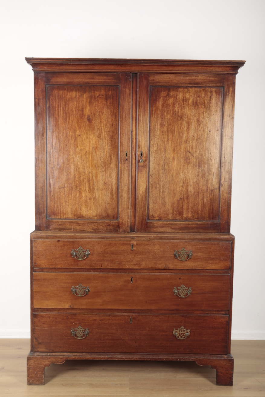 It appears to be in good order. There are several indentations throughout, in particular to the moulded cornice. The upper section has several areas of discolouration and small surface marks. Minor losses to some moulding and edges. The feet have been historically repaired and have supporting chocks to each foot. Some splits are present to the interiors of the drawers.