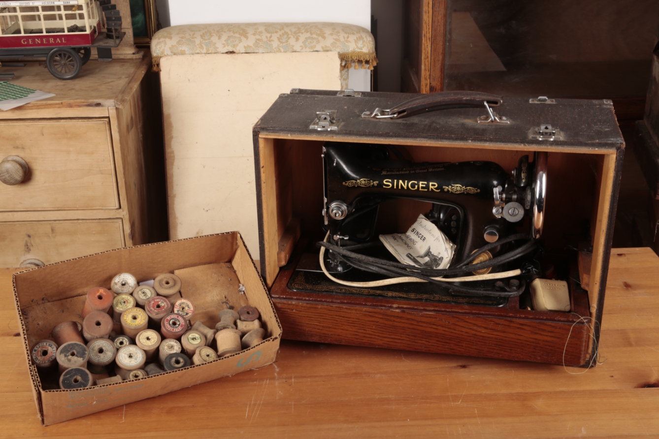Serial number EG427263, with lamp, foot pedal and instruction booklet, cased, with a collection of vintage cotton reels (a lot)
