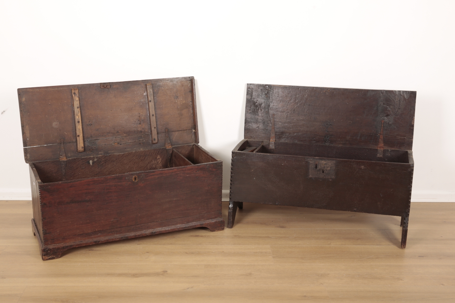 the single plank top above vacant interior with candle box, terminating on 'clothes peg' shaped stiles with front corner edges with notched detailing, 44cm high x 89cm long x 32cm deep; together with another similar smaller and later example (2)