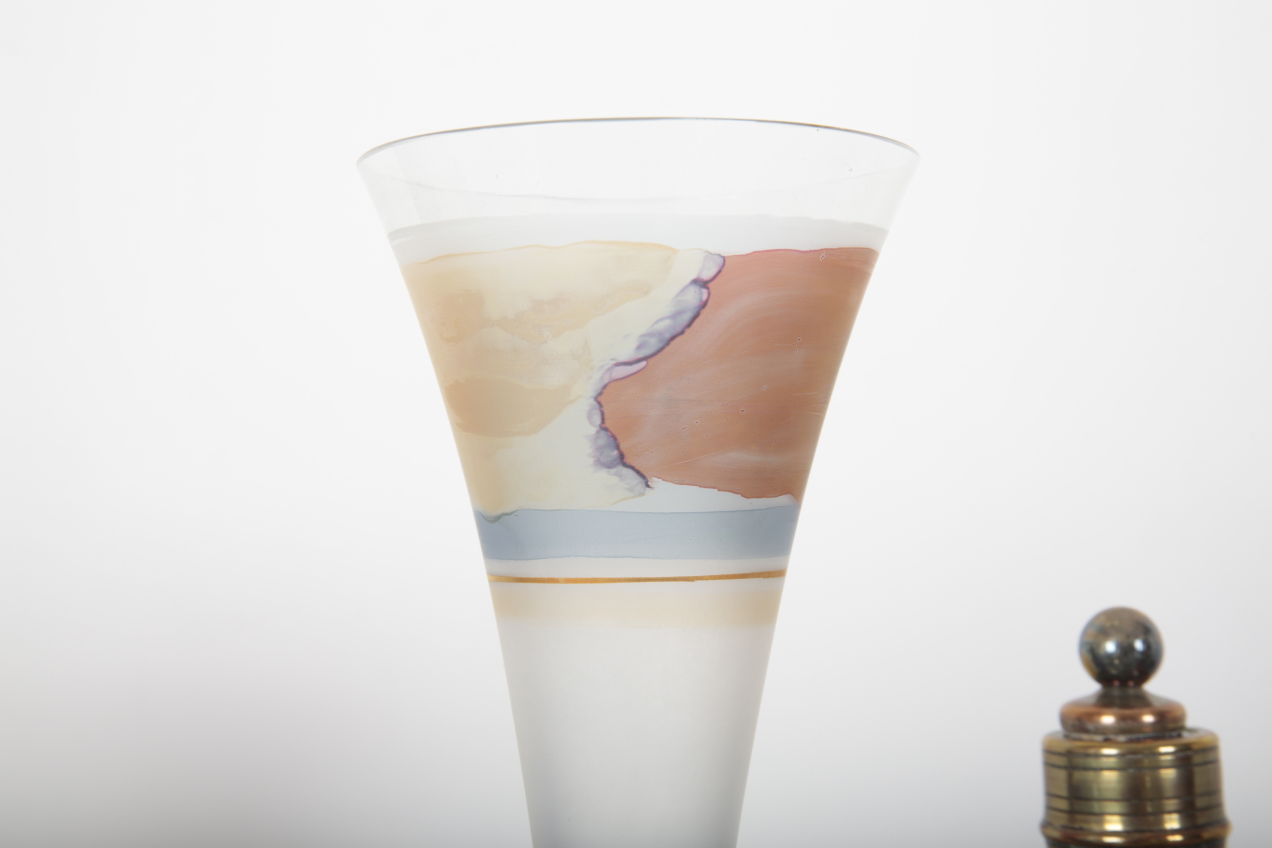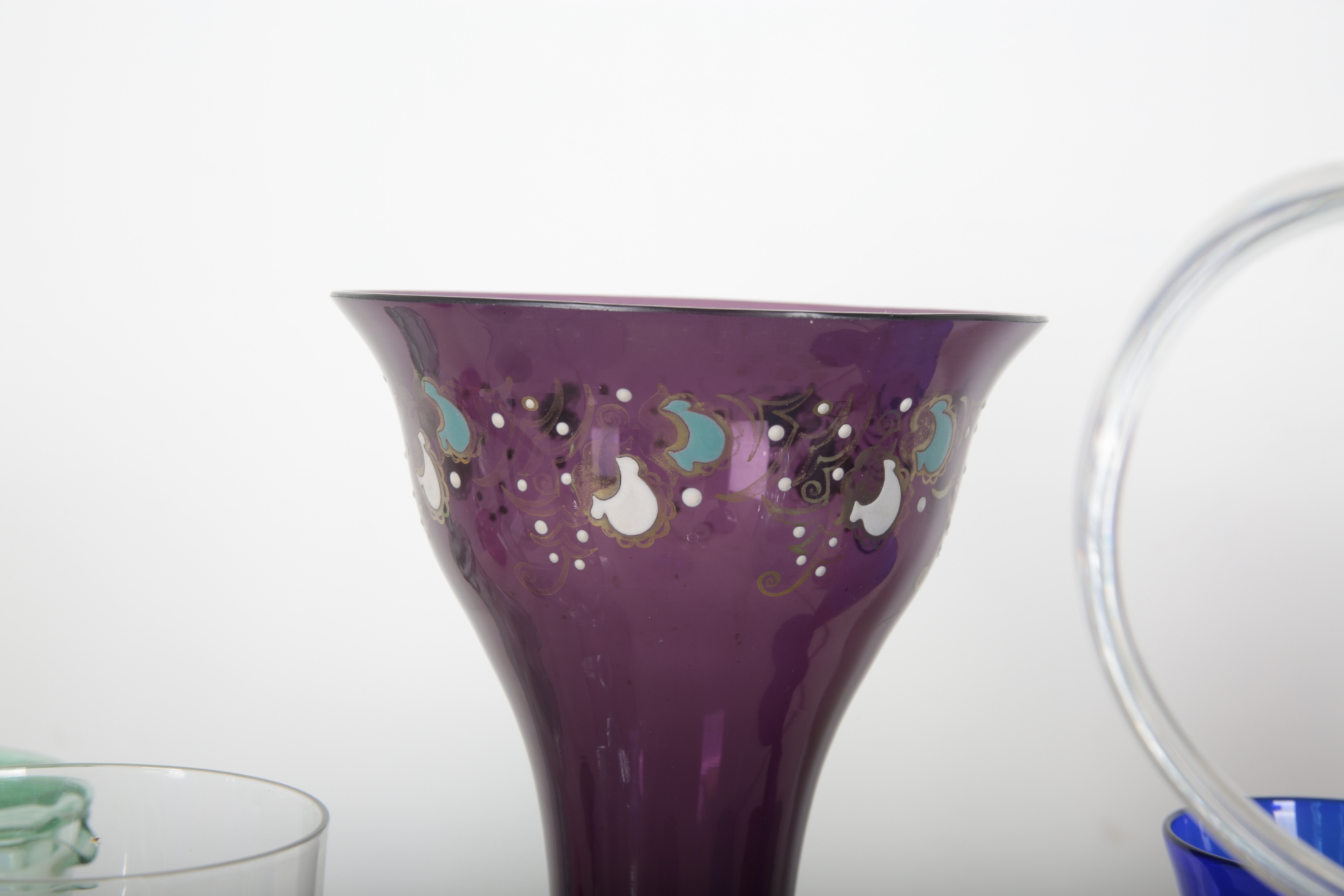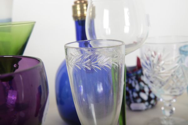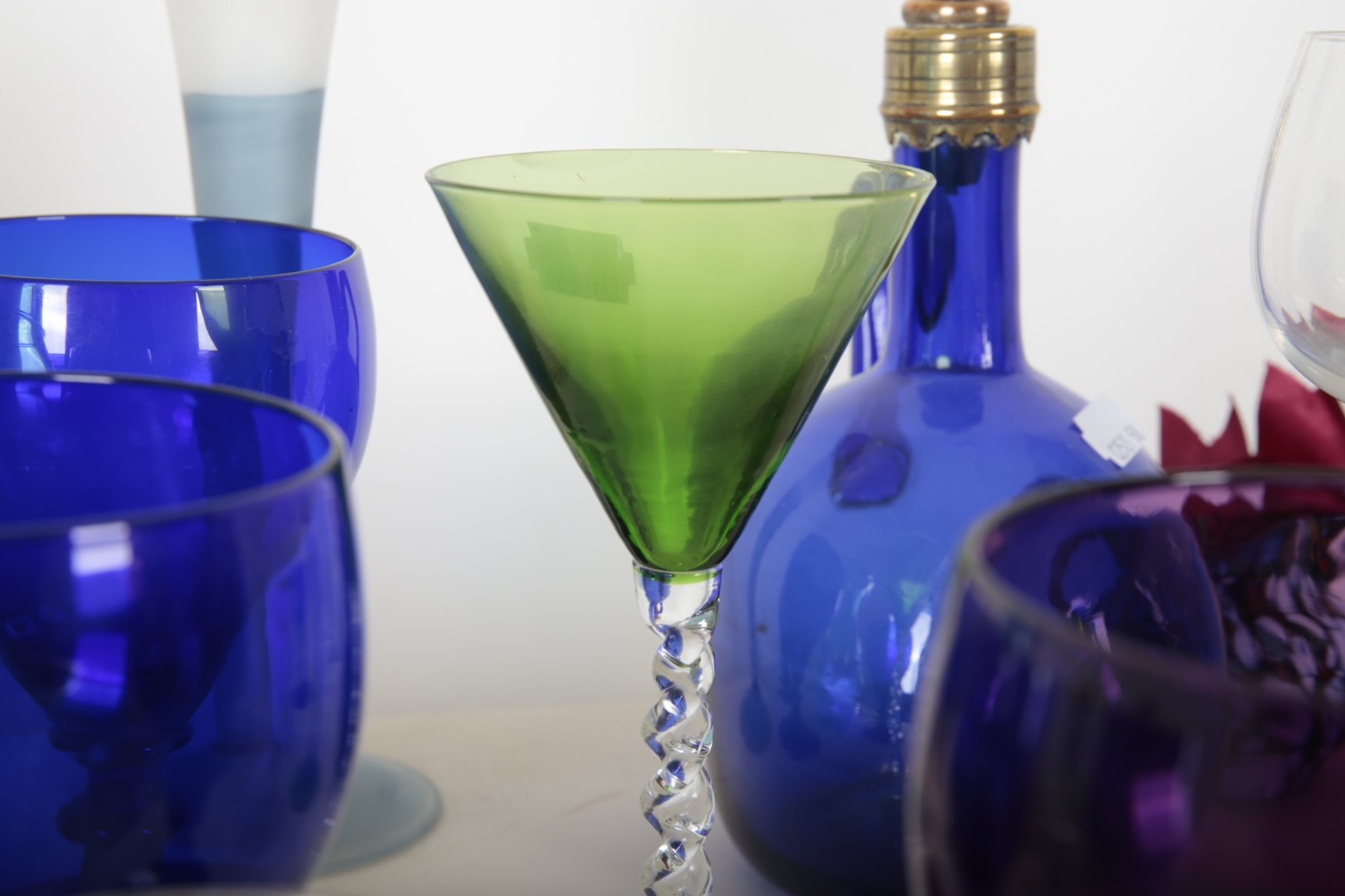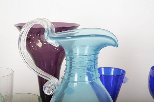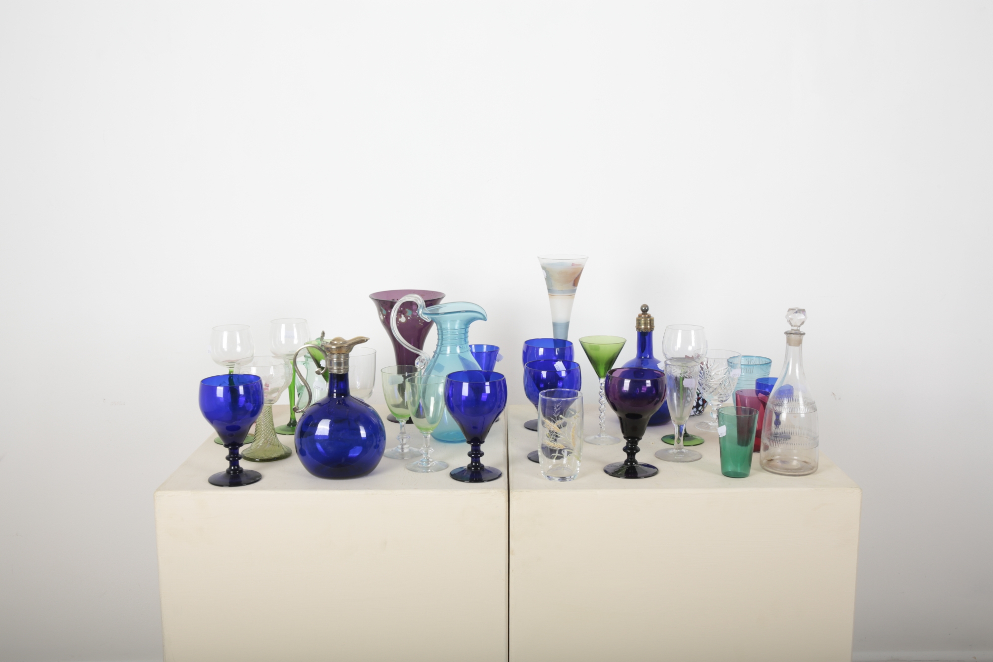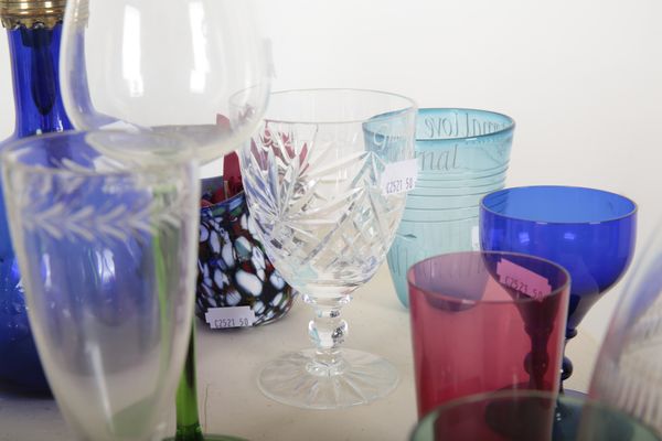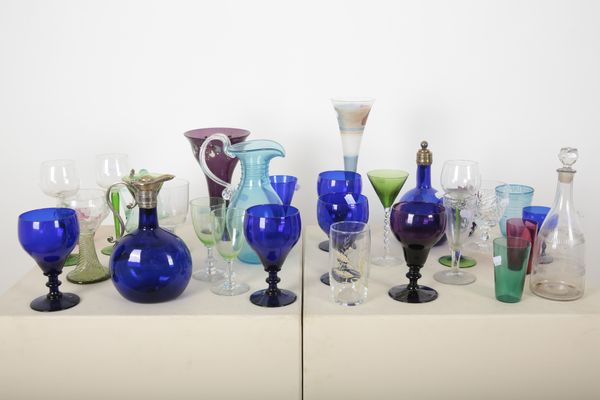 with pronounced spout and bulbous body, 23cm high; together with a similar decanter with stopper top; four ‘Bristol Blue’ rummers; and a quantity of coloured and clear glass (30)