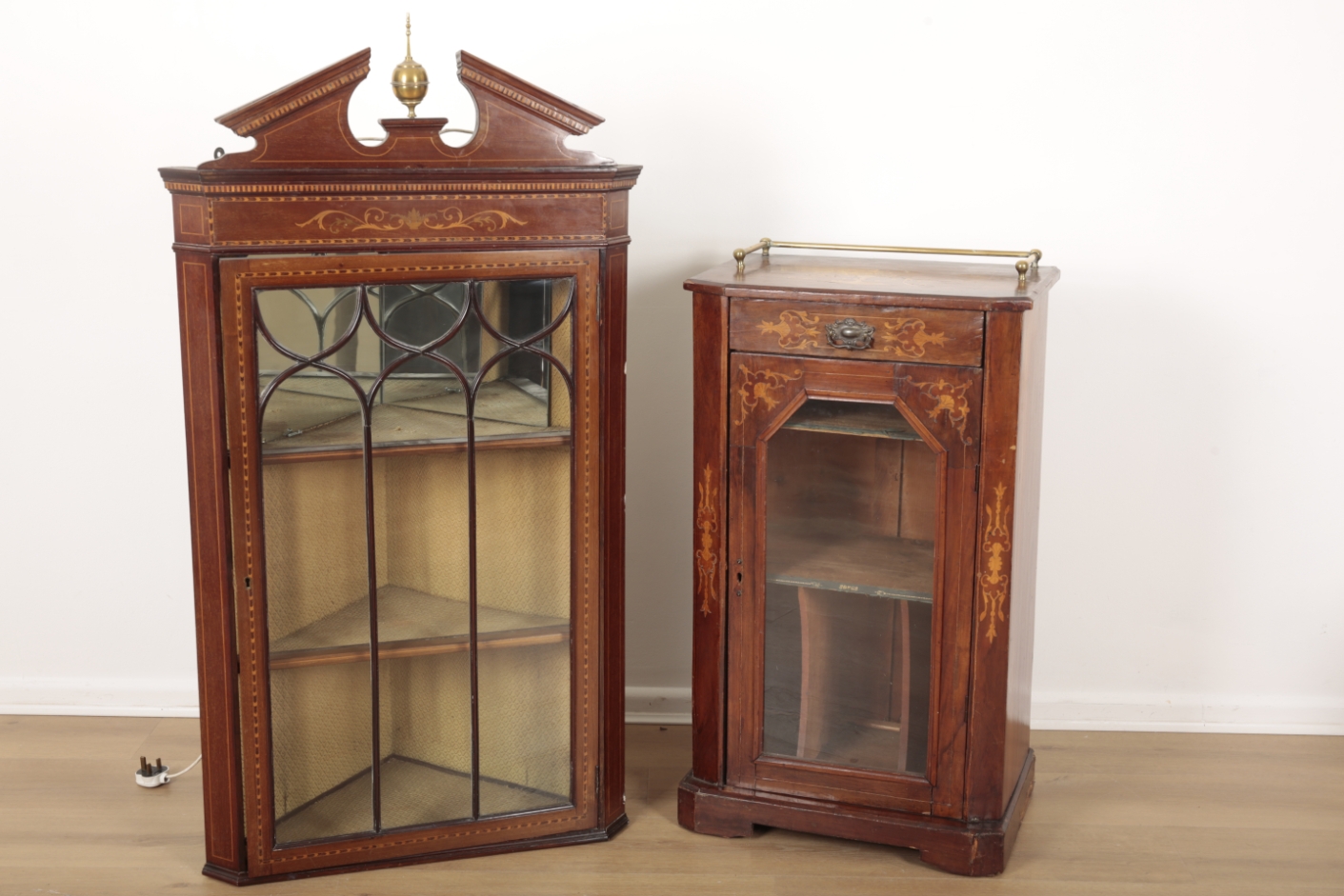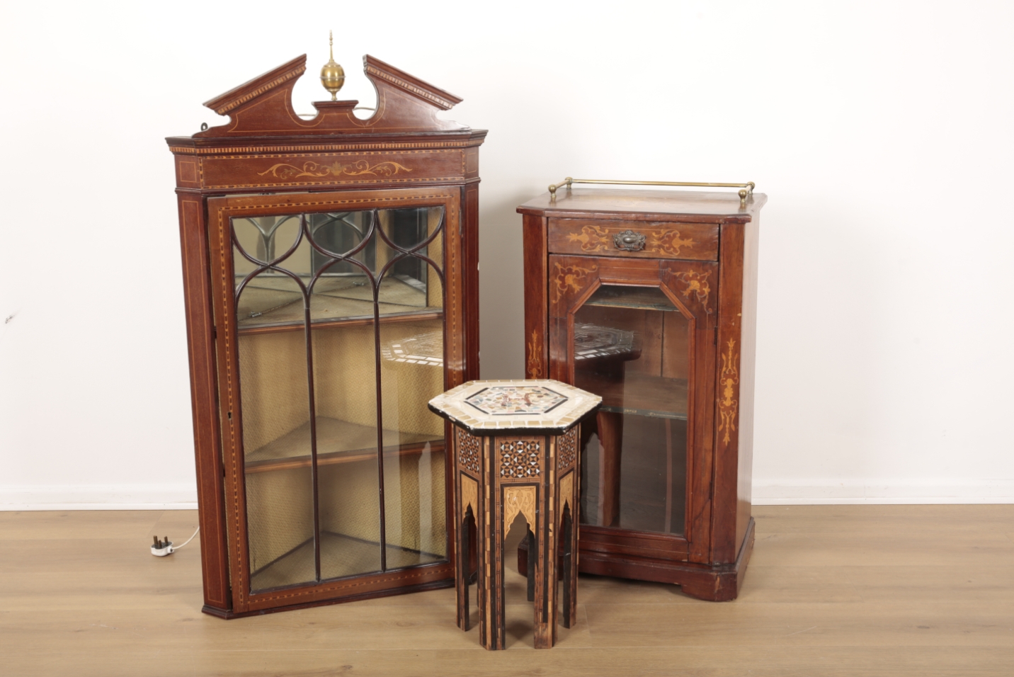 with angled pediment and brass pediment, the fabric lined interior fitted two shelves enclosed by astragal door; together with a late Victorian inlaid mahogany music cupboard; and an inlaid Near Eastern occasional table with repaired top (3)