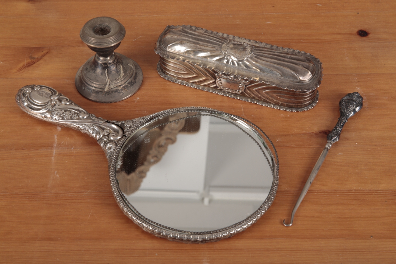by Mappin & Webb, London 1900, with chevron body and crimped rims, 5cm high x 17cm wide x 5cm deep, 5.5 tr. ozs; together with a silver handled button hook; a silver backed hand mirror; and a silver squat candlestick (loaded) (4)