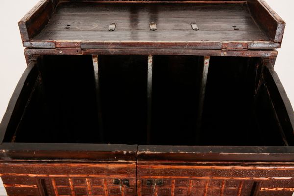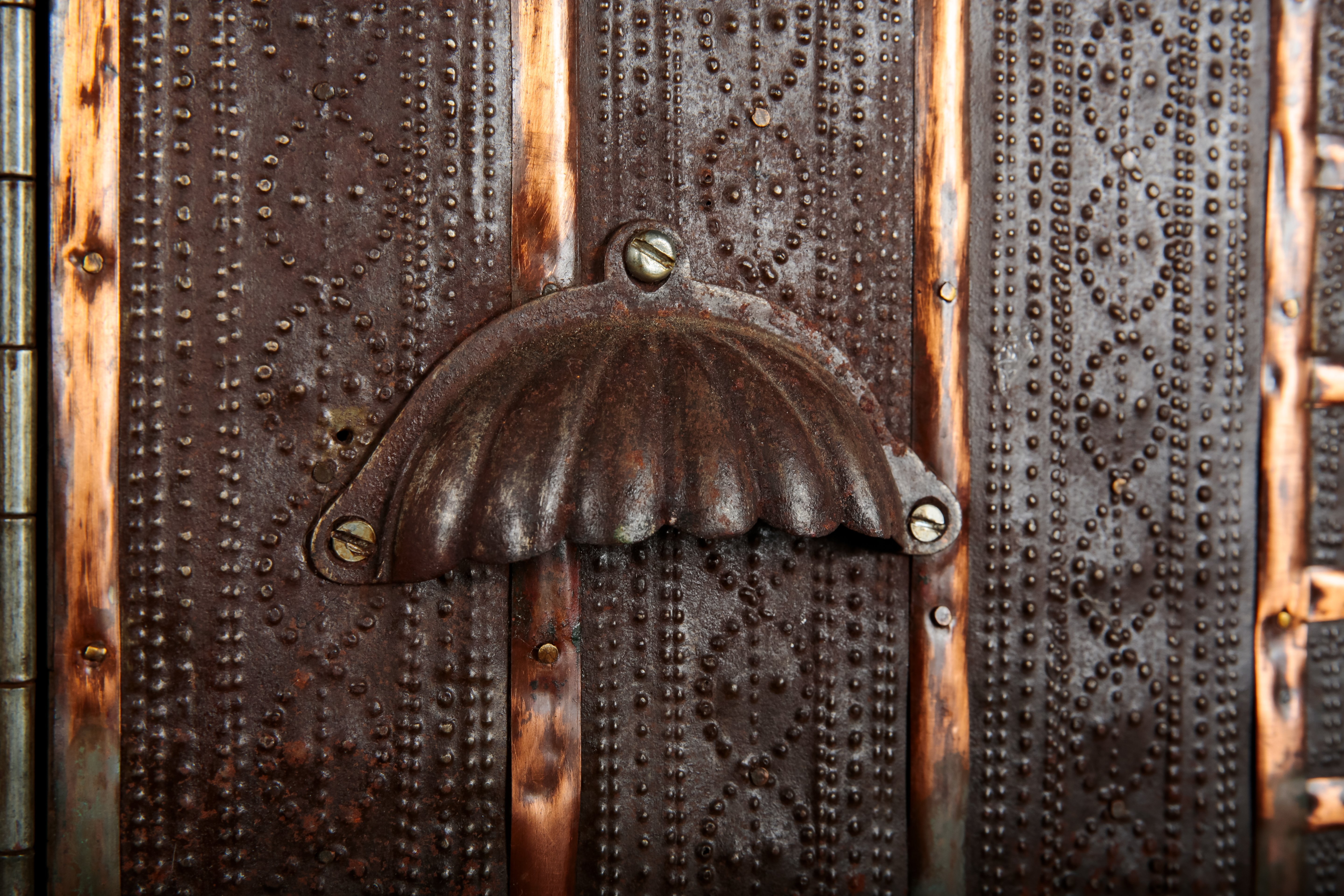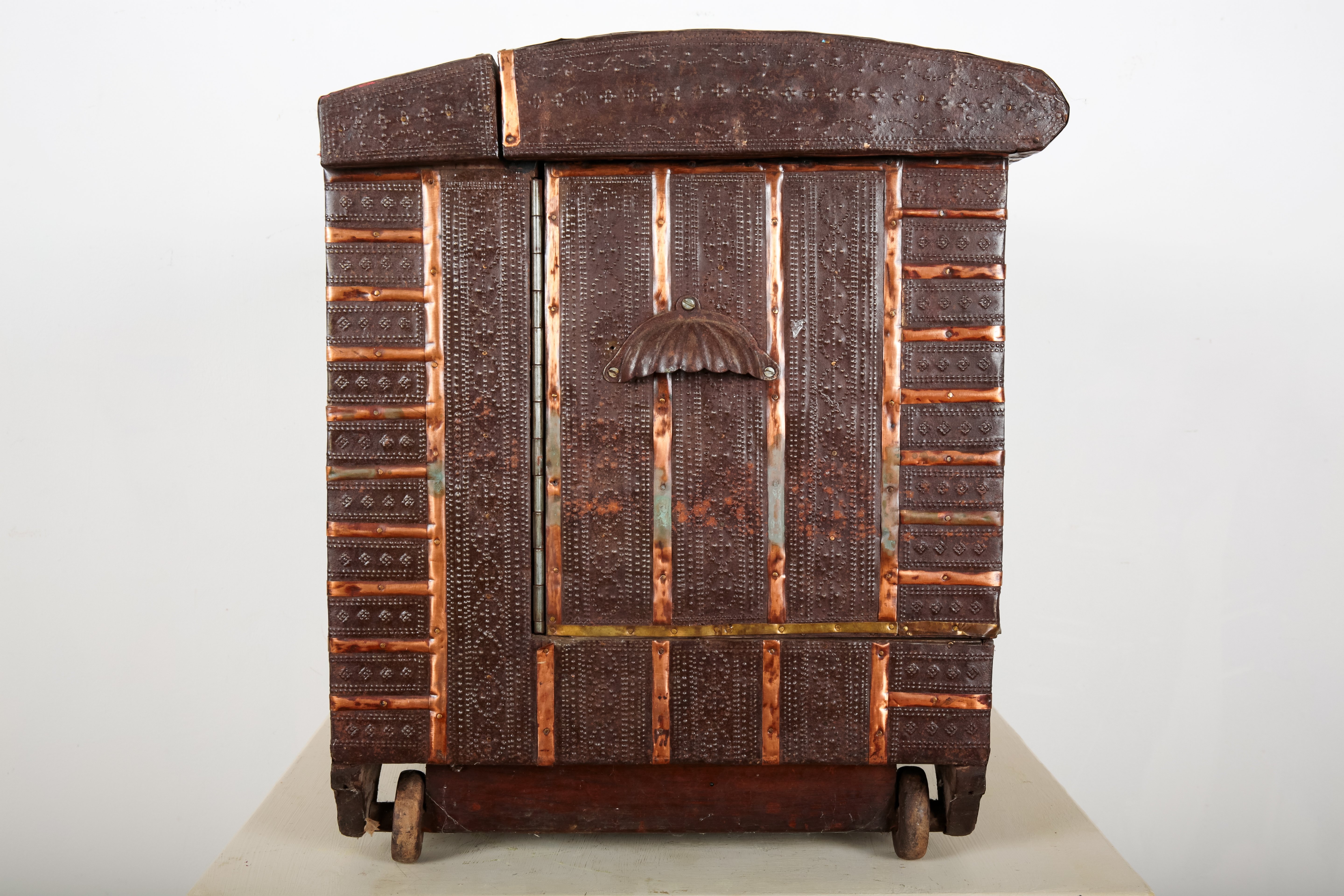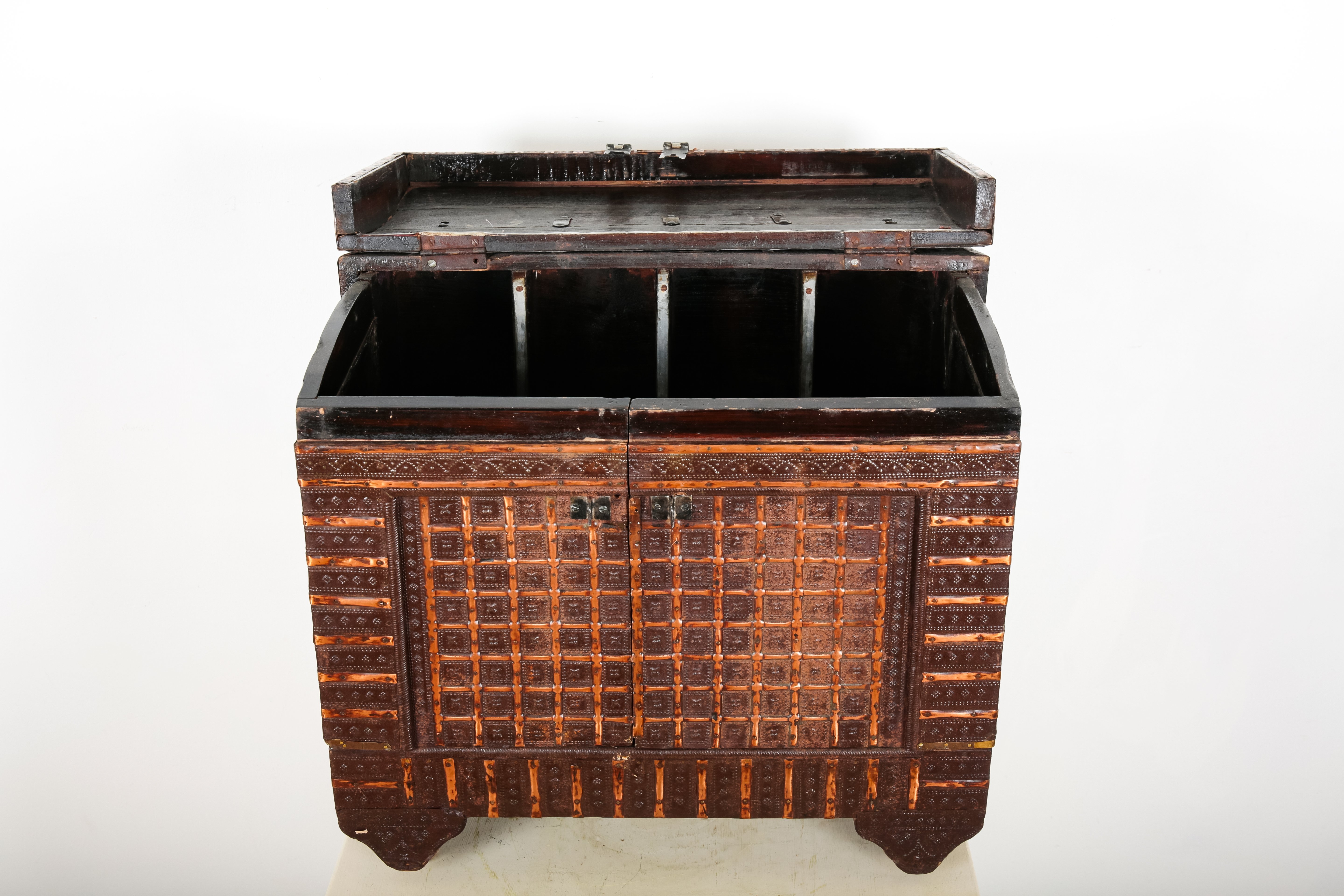 with decorative copper banding throughout, with internal compartments, terminating on bracket feet, 44cm high x 52.5cm wide x 37cm deep