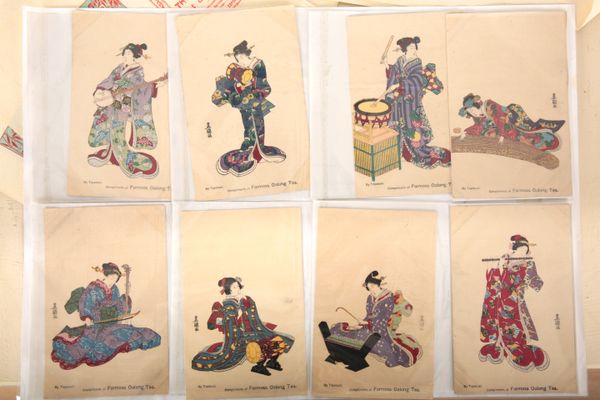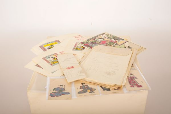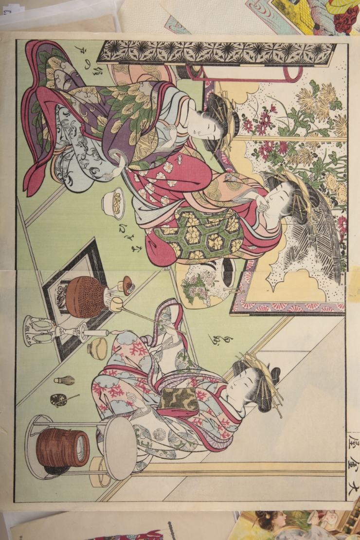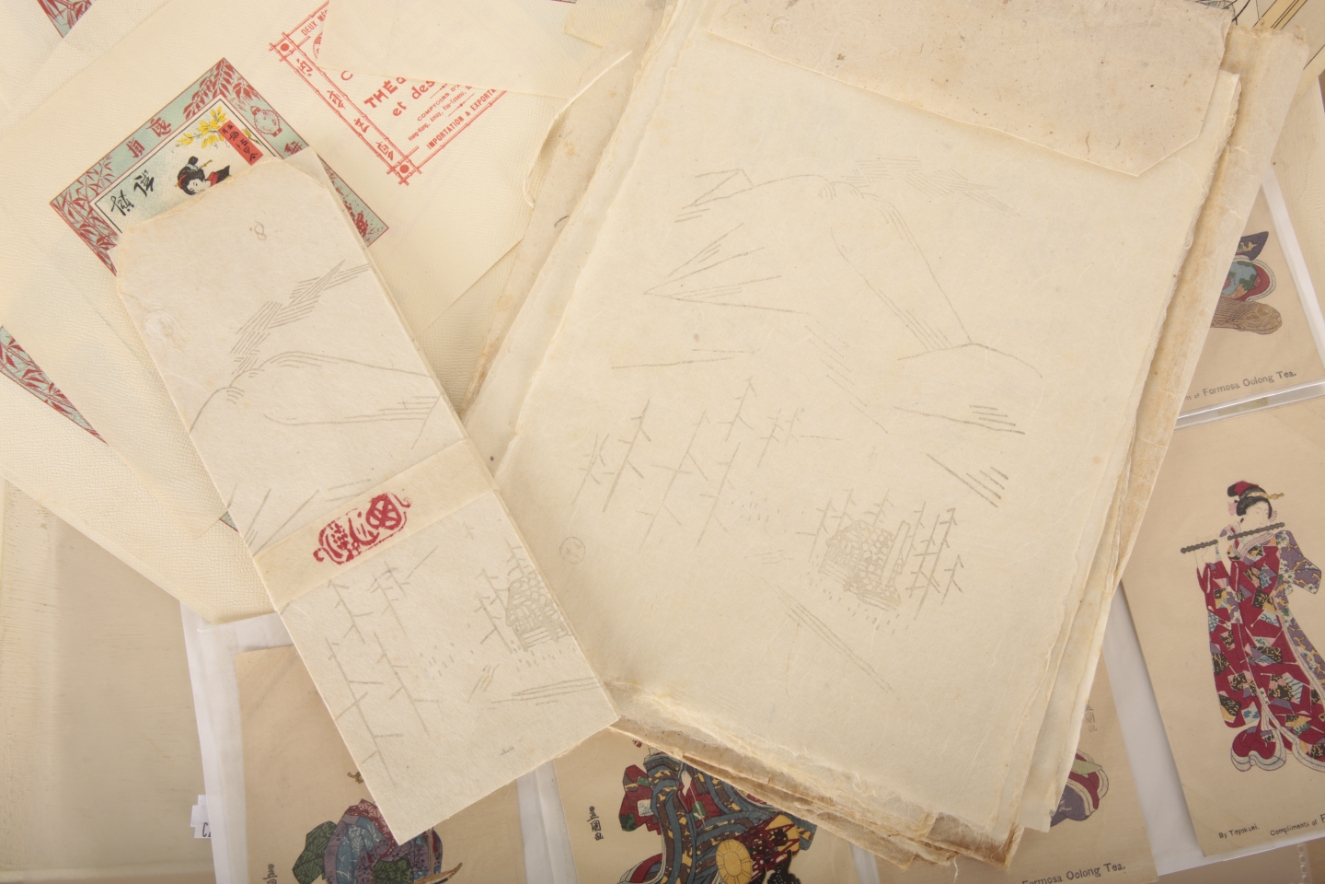 20th century, woodblock print, 24cm x 32cm; together with a collection of woodblock proofs, 28cm x 20cm; and a collection of Toyokuni figural prints inscribed 'compliments of Formosa Oolong Tea.' (a lot)