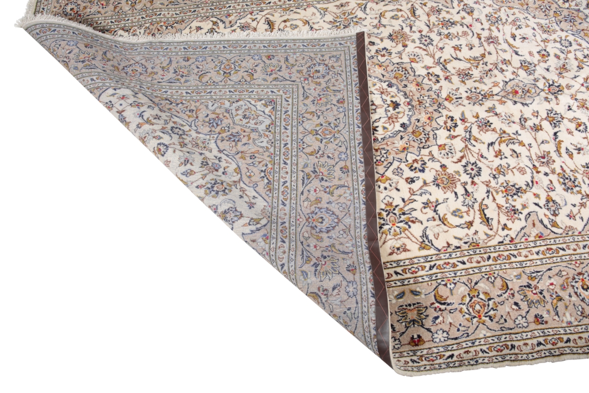 with cream and taupe background interspersed with blue flowers and foliage, all within conforming borders, 300cm x 195cm