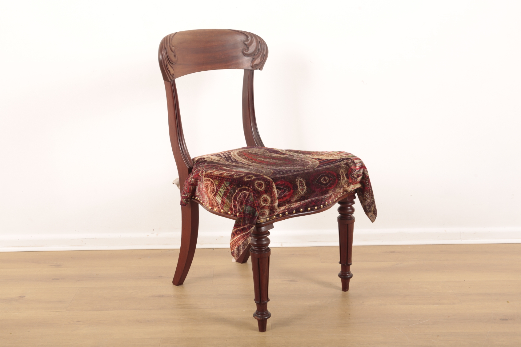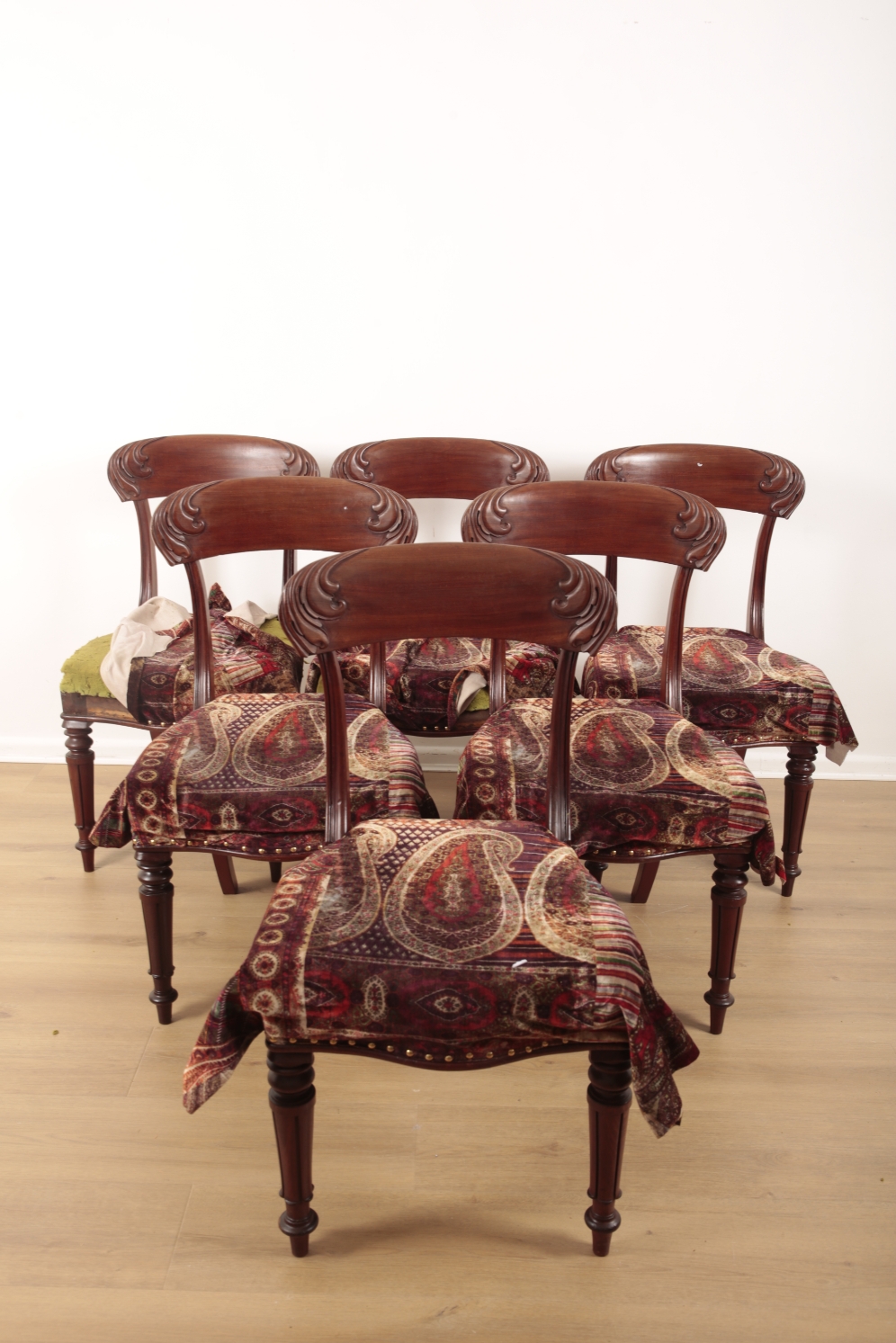 19th century, the curved seat backs foliate carved, the seats covered in velvet paisley fabric with modern foam upholstery, terminating on straight reeded front legs and sabre legs to the rear, 87cm high (47cm seat height) x 48cm wide x 60cm deep (6)