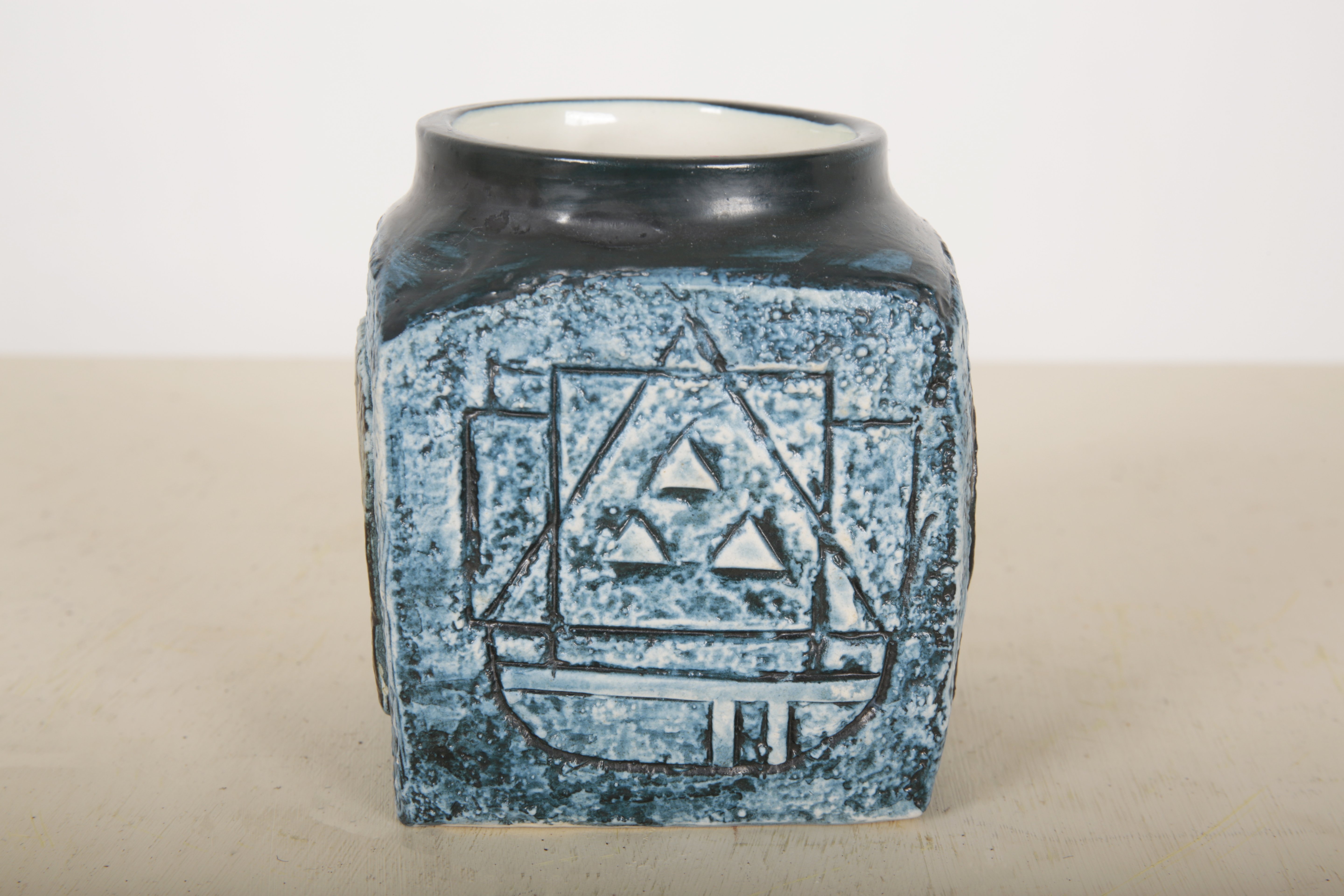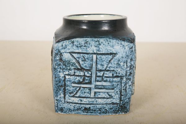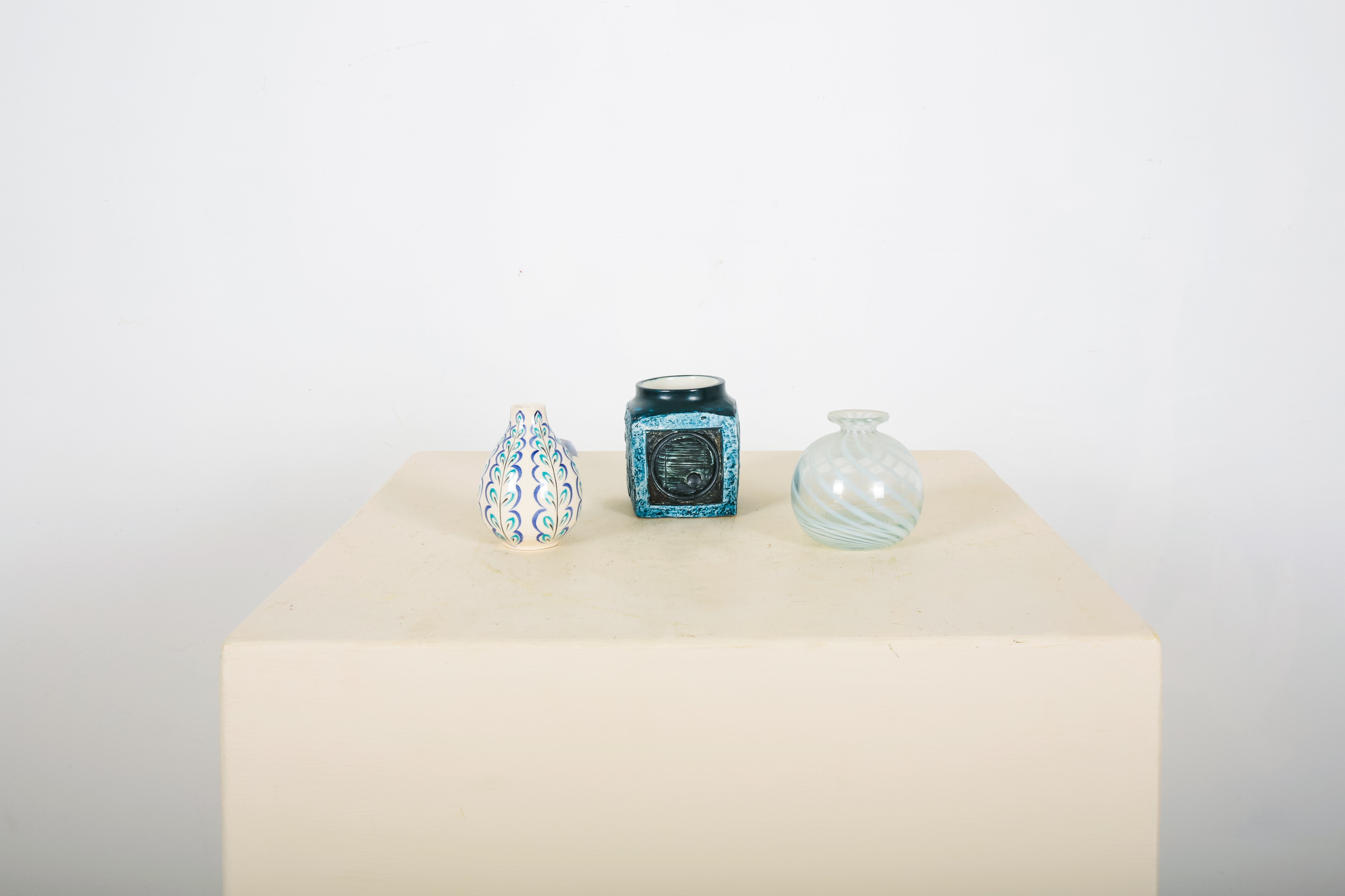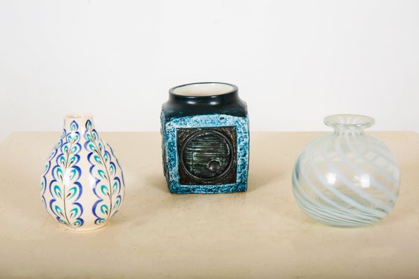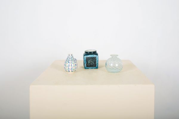 decorated in blue and black with abstract designs, 9.5cm high x 8cm square, painters mark TR; together with a Poole Studio pottery vase, 9cm high; and a glass ‘Latticino’ vase, 9cm high (3)