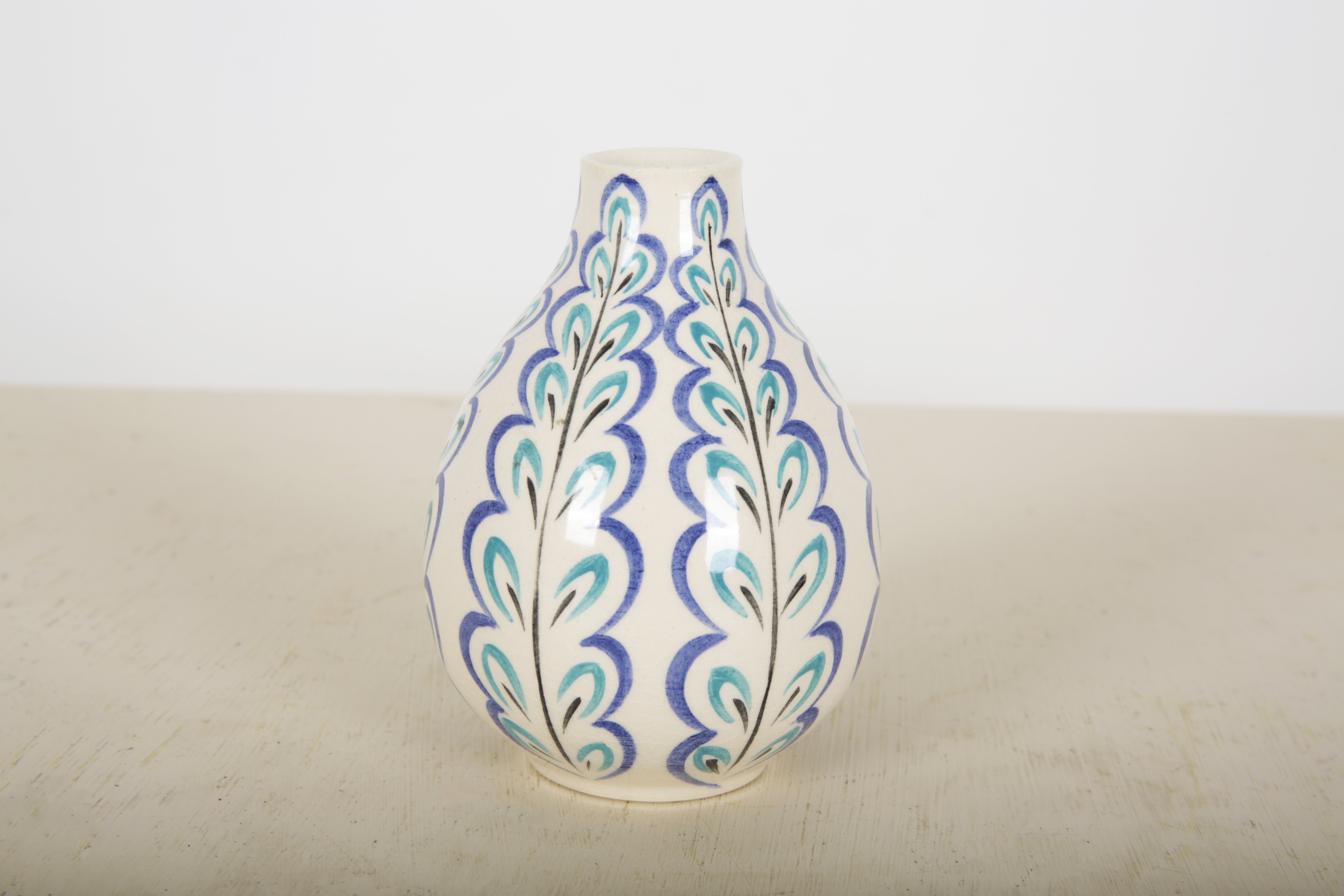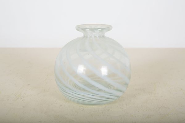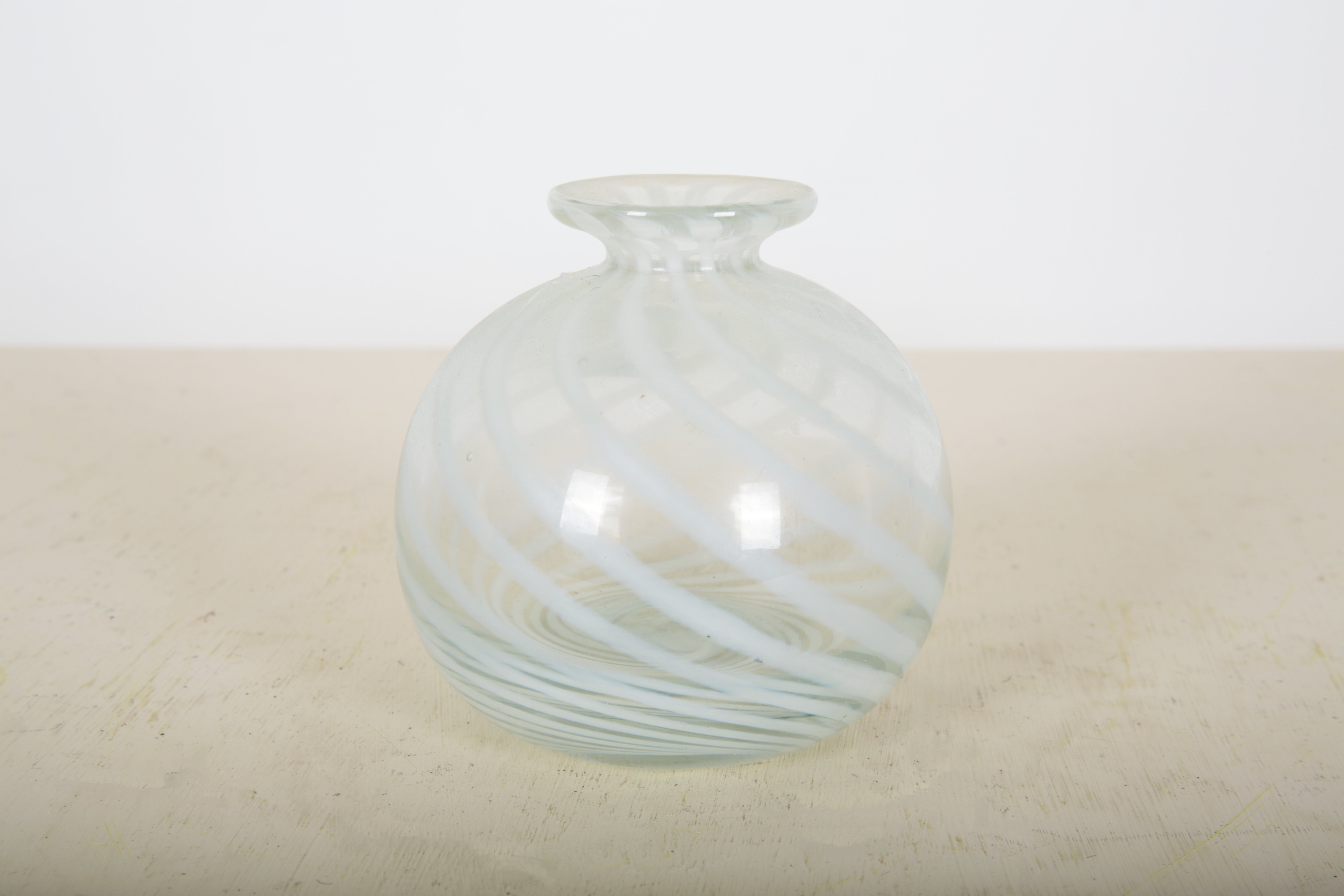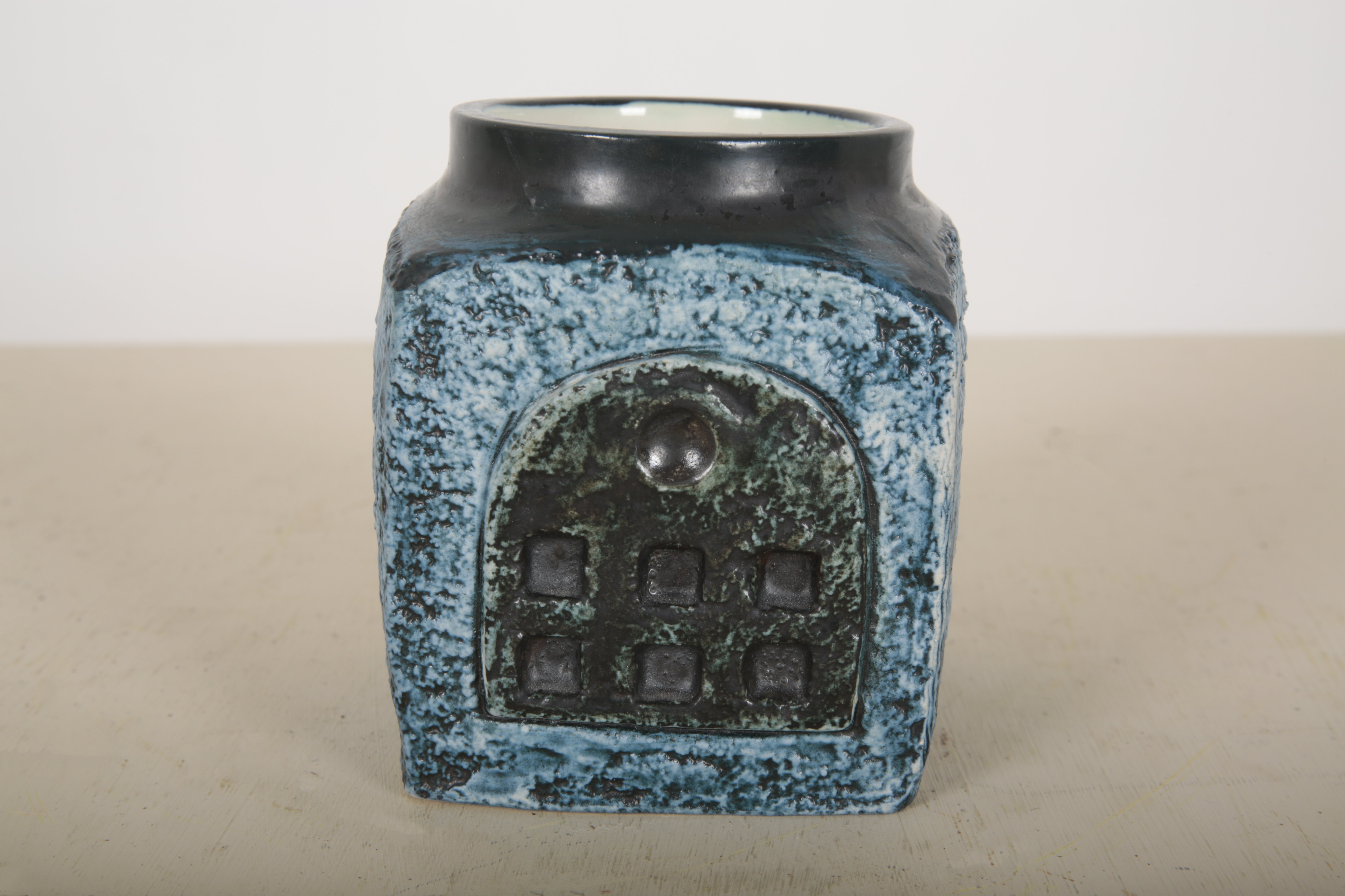 decorated in blue and black with abstract designs, 9.5cm high x 8cm square, painters mark TR; together with a Poole Studio pottery vase, 9cm high; and a glass ‘Latticino’ vase, 9cm high (3)