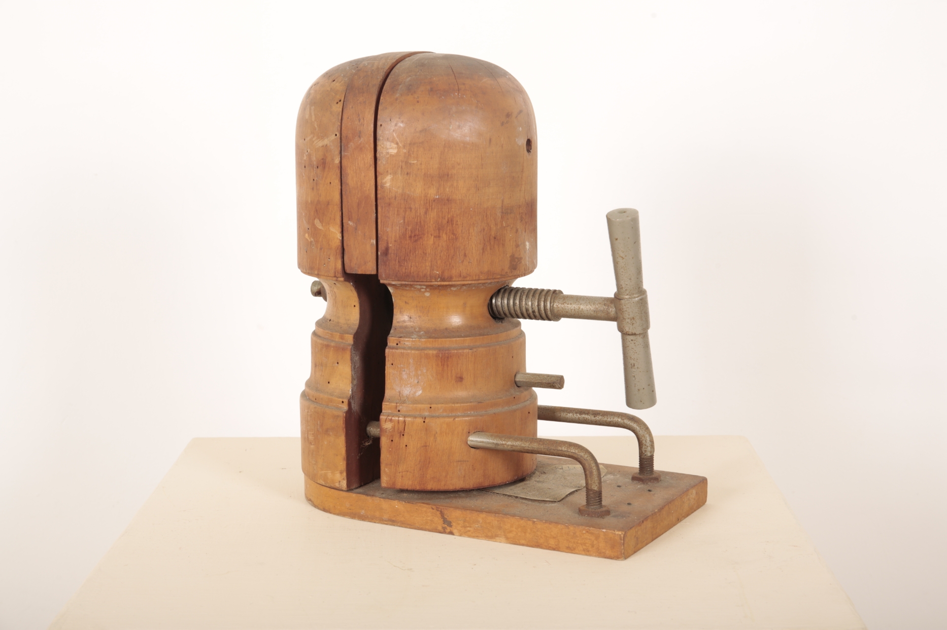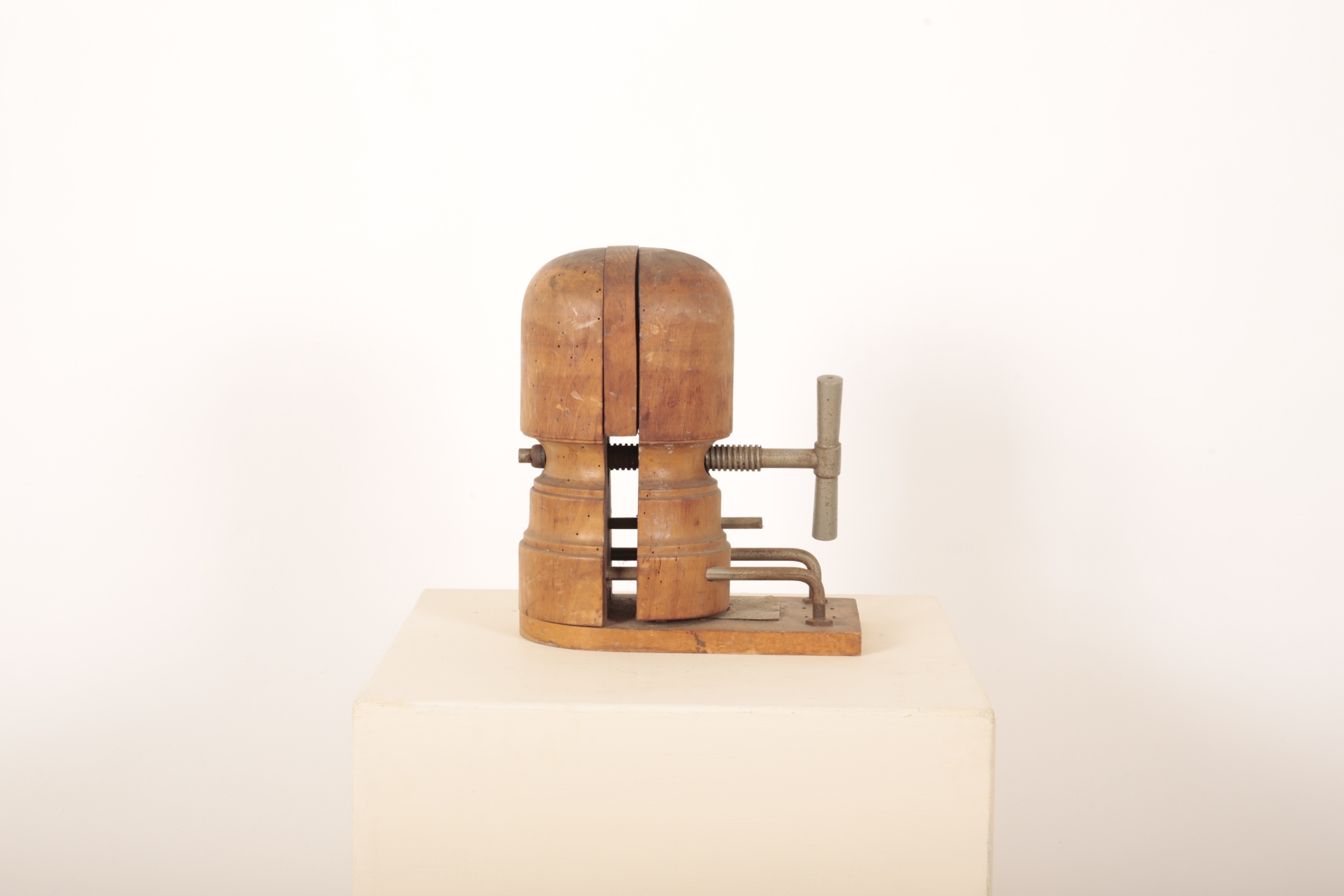 mounted on wood plinth with white metal support and turn handle, 35cm high x 30cm wide x 16cm deep
