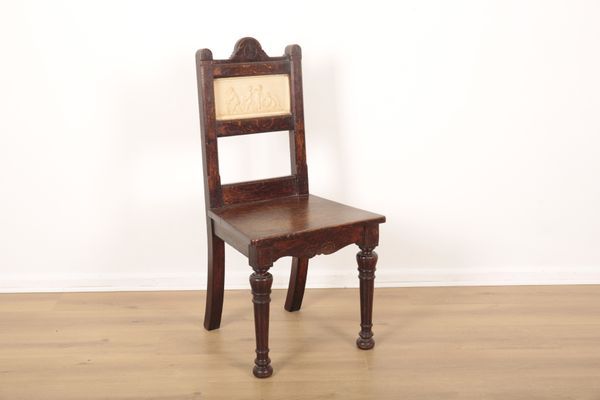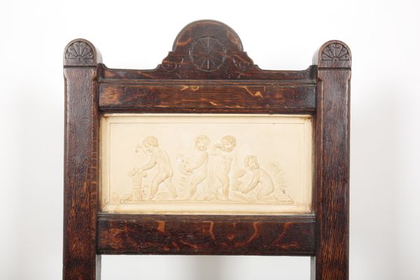 with angled chamfered legs, 40cm high x 37cm wide x 25cm deep; together with a pitch pine high stool or occasional table of Gothic style; and a Victorian oak hall chair, the back inset with pottery plaque (3)