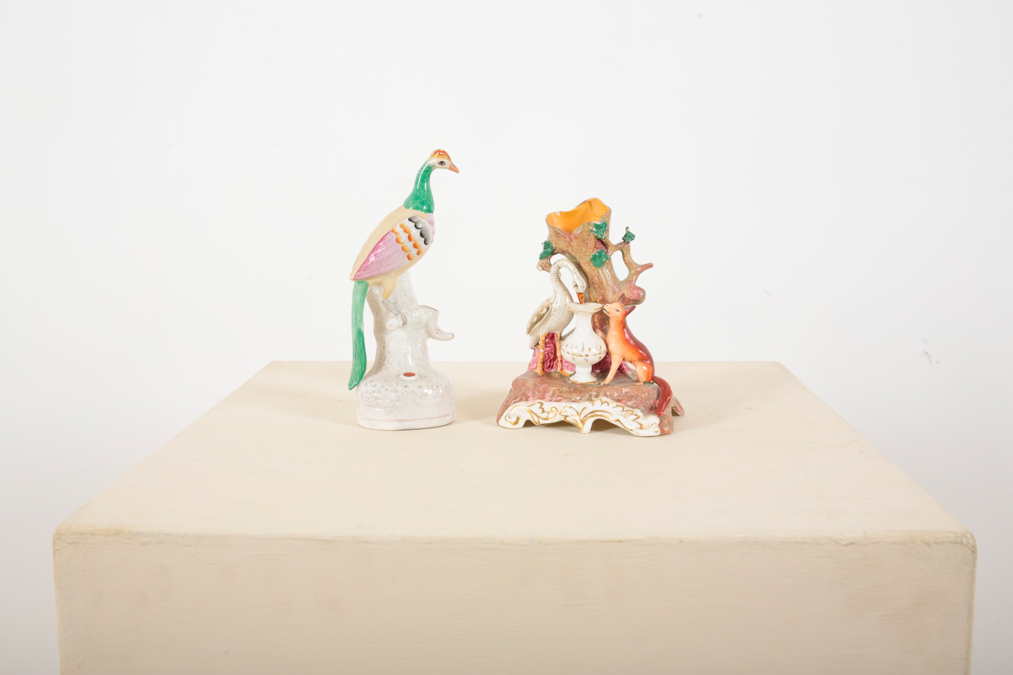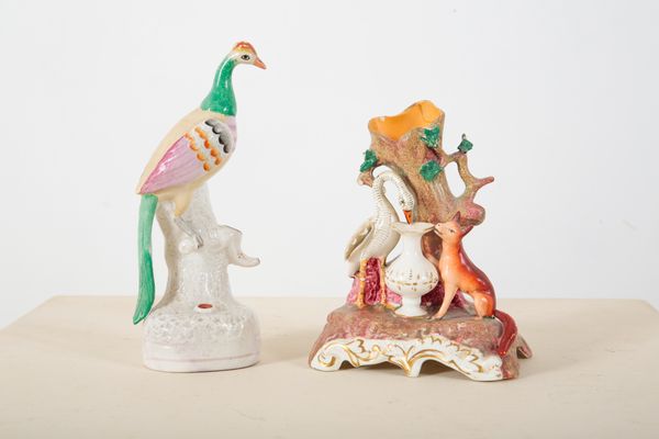 19th century, modelled as a fox and swan flanking a central urn, 18cm high; together with a quill holder modelled as a bird upon a stump, 21cm high (2)