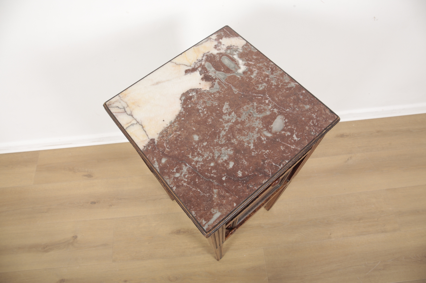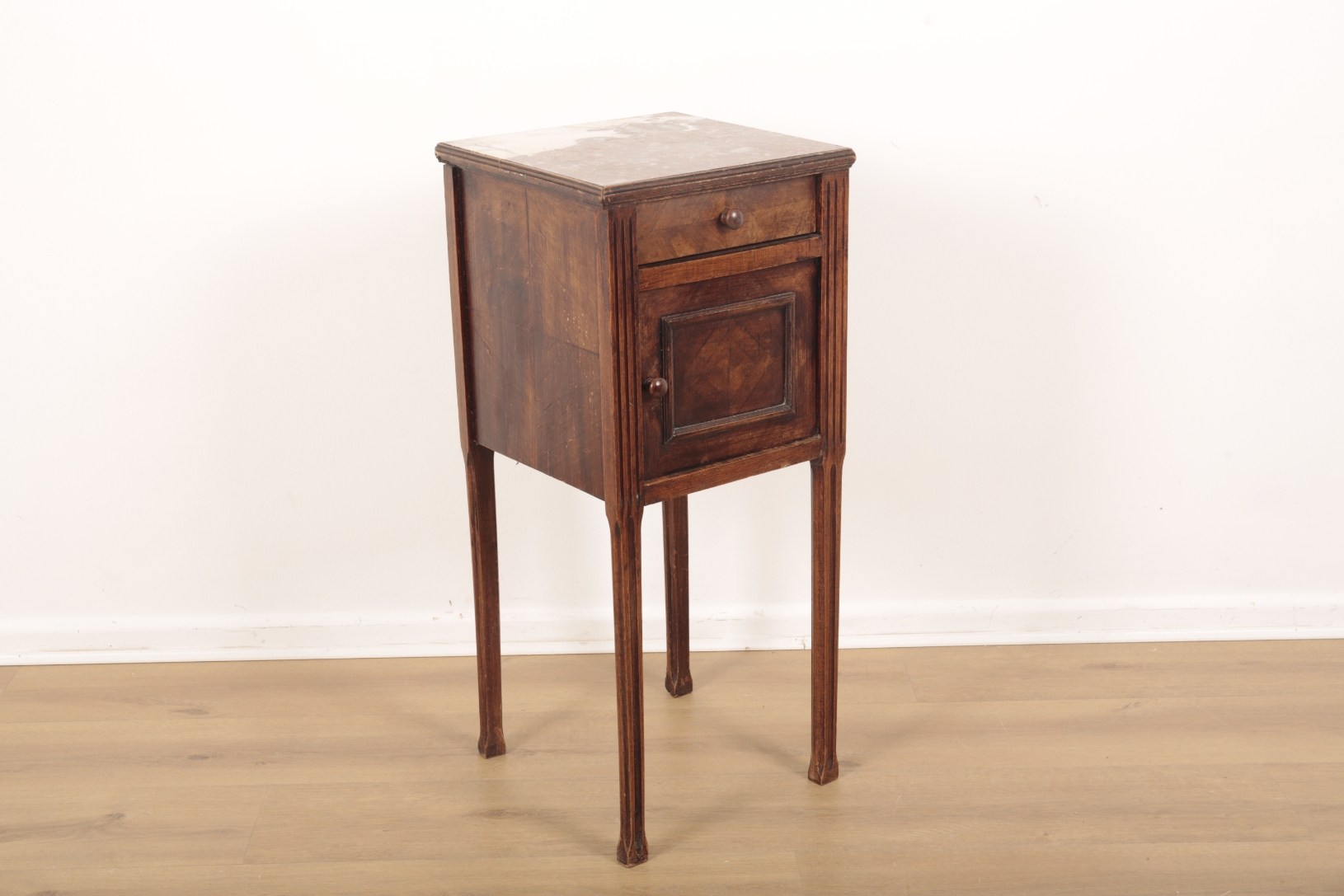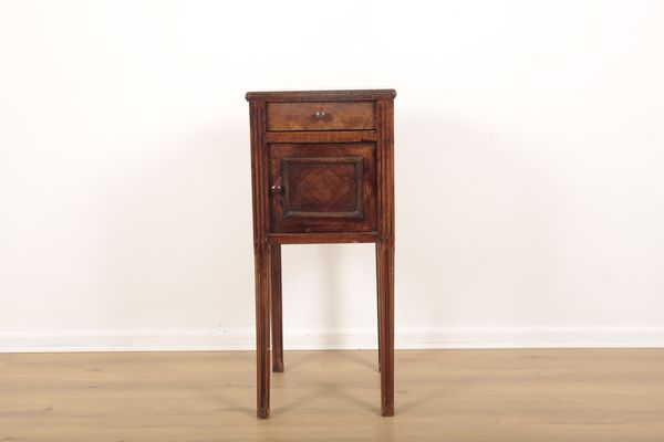 A FRENCH WALNUT AND MARBLE TOPPED BEDSIDE TABLE