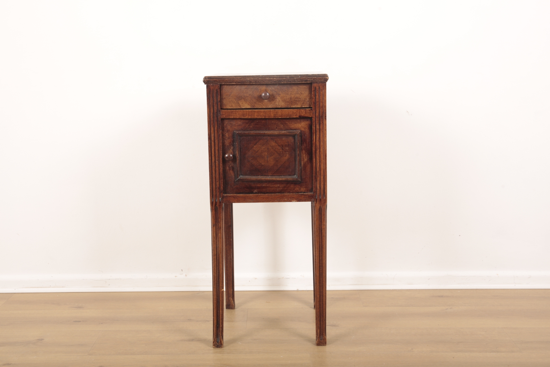 the moulded top above one drawer and one door, with reeded sides, terminating on reeded chamfered legs, 81cm high x 35cm wide x 35cm deep