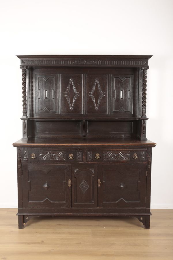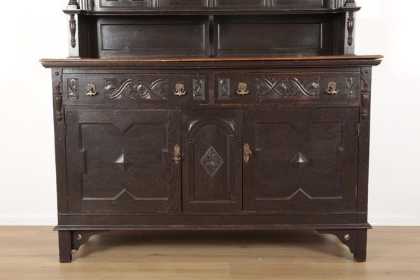the base with two leaf carved drawers above cupboards enclosed by panelled doors, on bracket feet, 96cm high x 153cm wide x 51cm deep