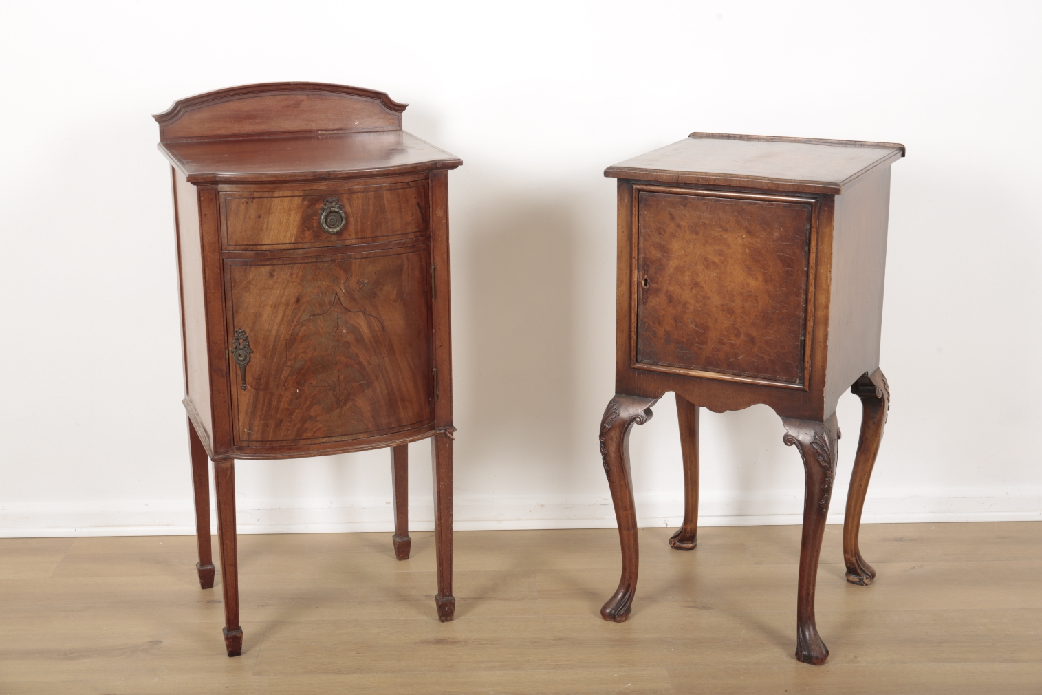 1920s, upholstered with loose floral cover, the cabriole legs with leaf carved knees, on scrolled pad feet, 47cm high x 52cm wide x 37cm deep; together with a matching bedside cupboard; and an Edwardian mahogany bowfront bedside cupboard (3)