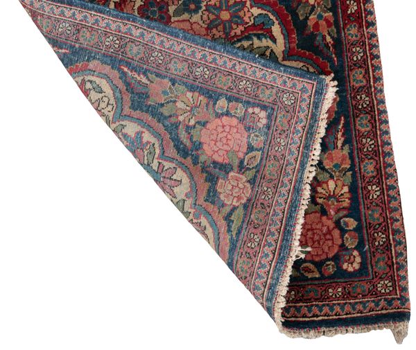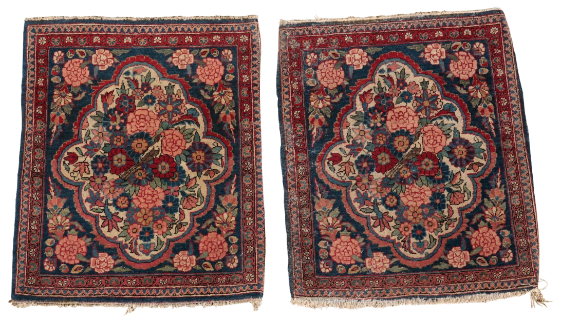 both of deep predominantly rich blue ground with central cream medallion of a bird amongst polychrome flowers, all within conforming borders, 61cm x 53cm (2)