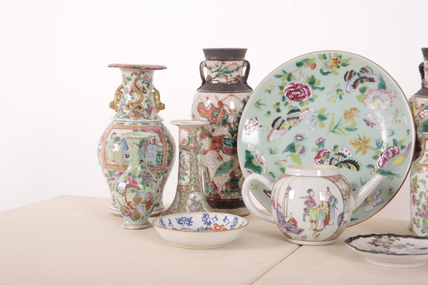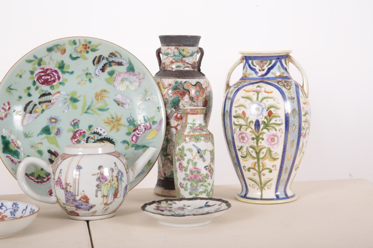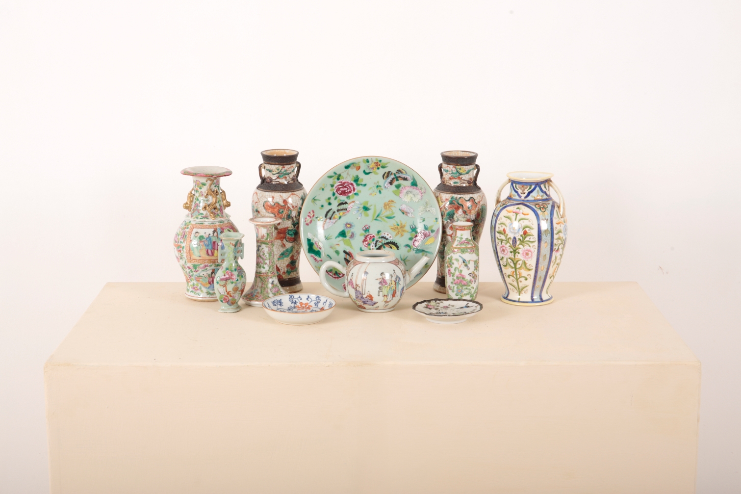 This lot appears to be in overall good condition, though the teapot shows multiple areas of repair with visible glue. The vases display wear on the bases, and the plates exhibit signs of general wear and some enamel fading with both the small and large plates showing hairline cracks. Additional photos are available on request.
