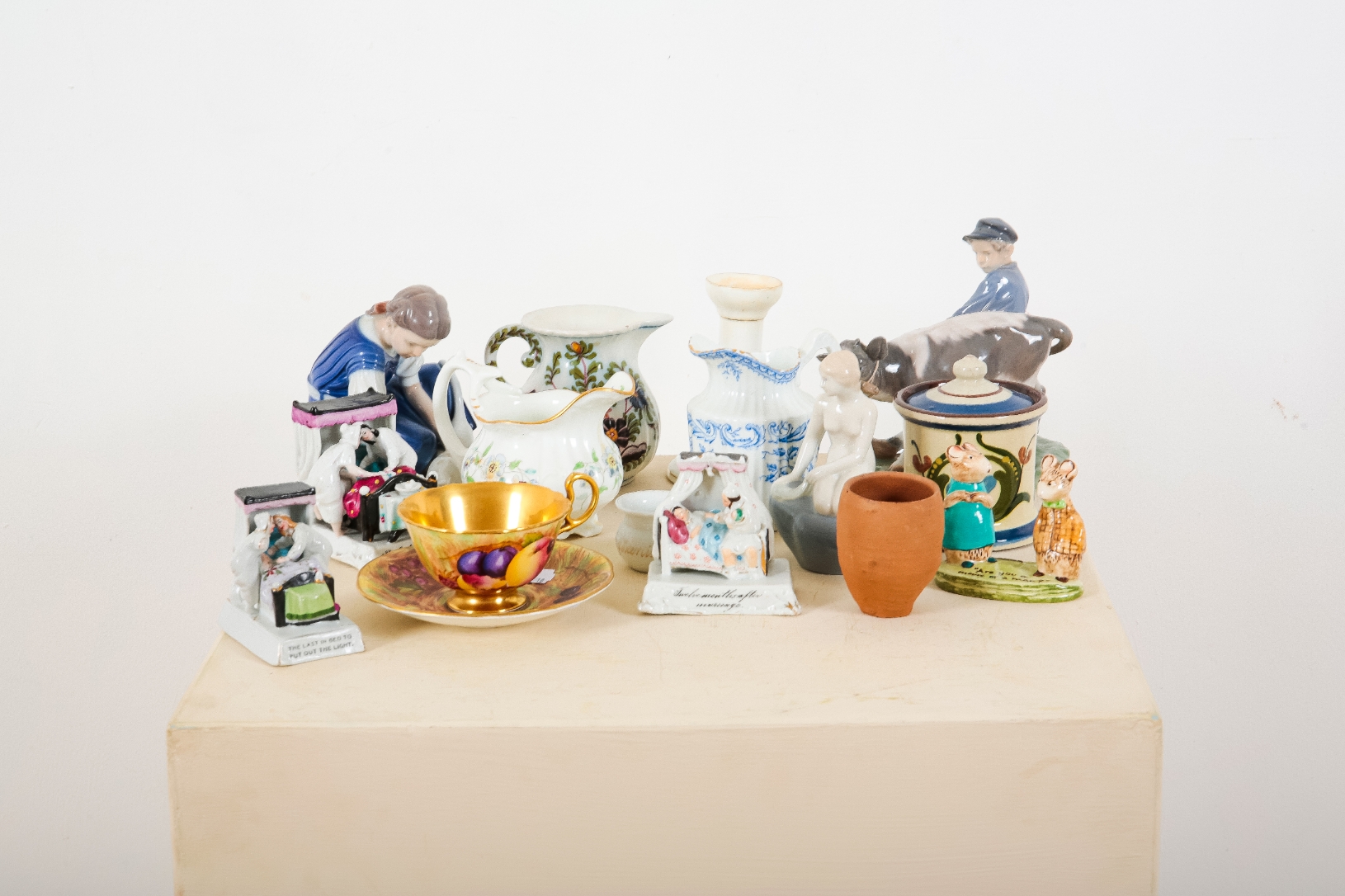 17cm high; together with a similar figure of a girl feeding a cat, 15cm high; an Aysnley fruit decorated cabinet cup and saucer; and a collection of decorative 19th century and later ceramics (a lot)