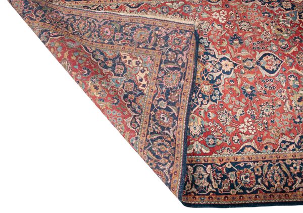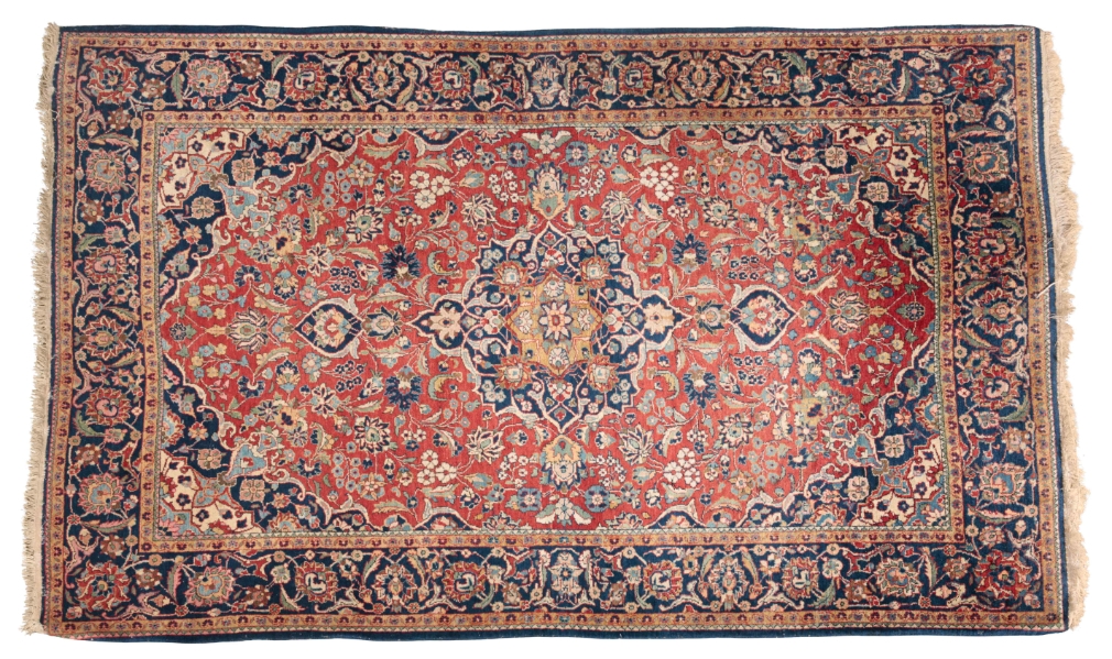 of predominantly madder ground with a central medallion containing stylised flowerheads, outlined in dark blue and all within conforming borders, 127cm x 204cm