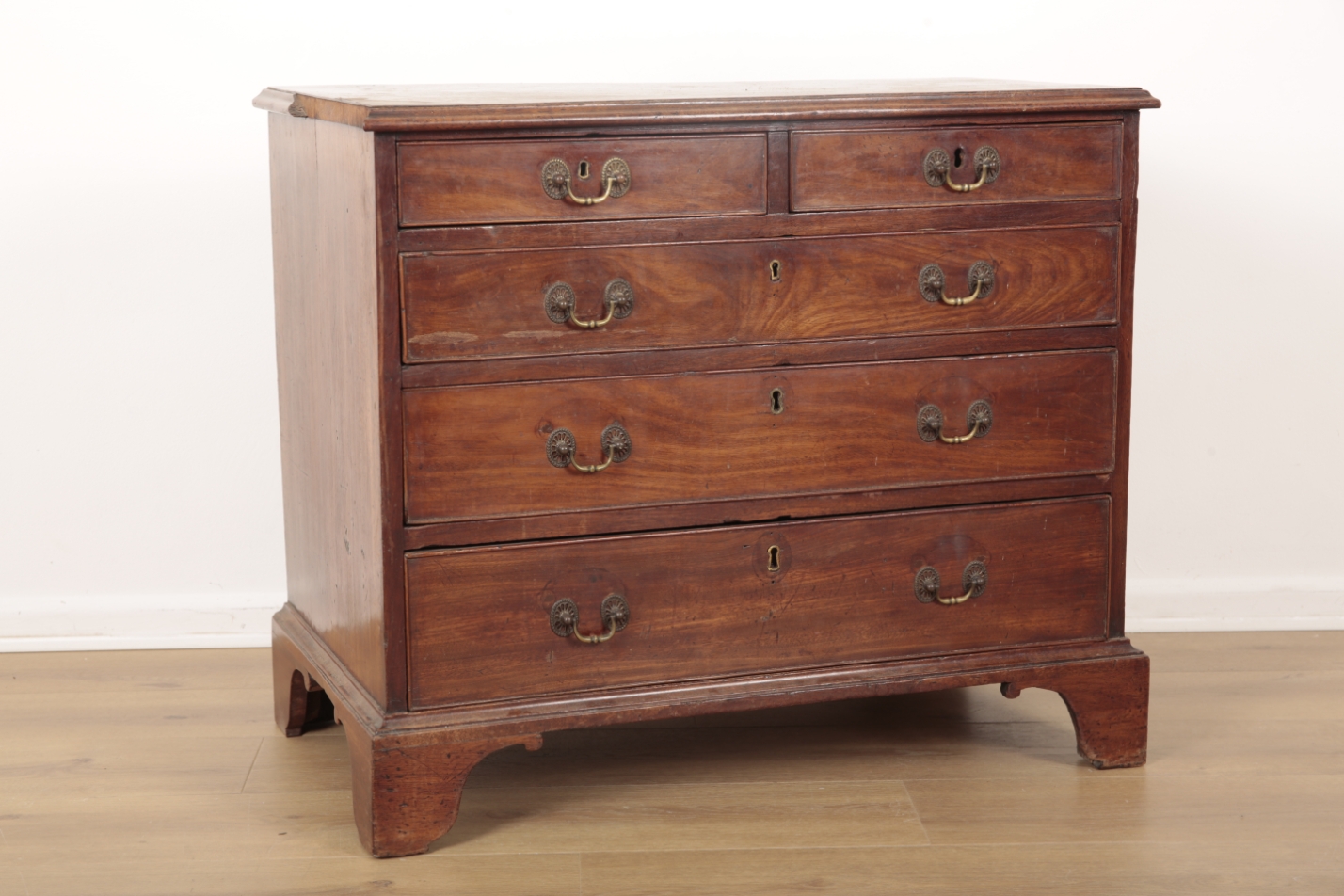 The top has an old repair in the left hand upper corner and some of the beaded edge is absent for about two thirds of the width (the missing section is in the top drawer). It has deep scratches, veneer splits and shrinkage and staining.