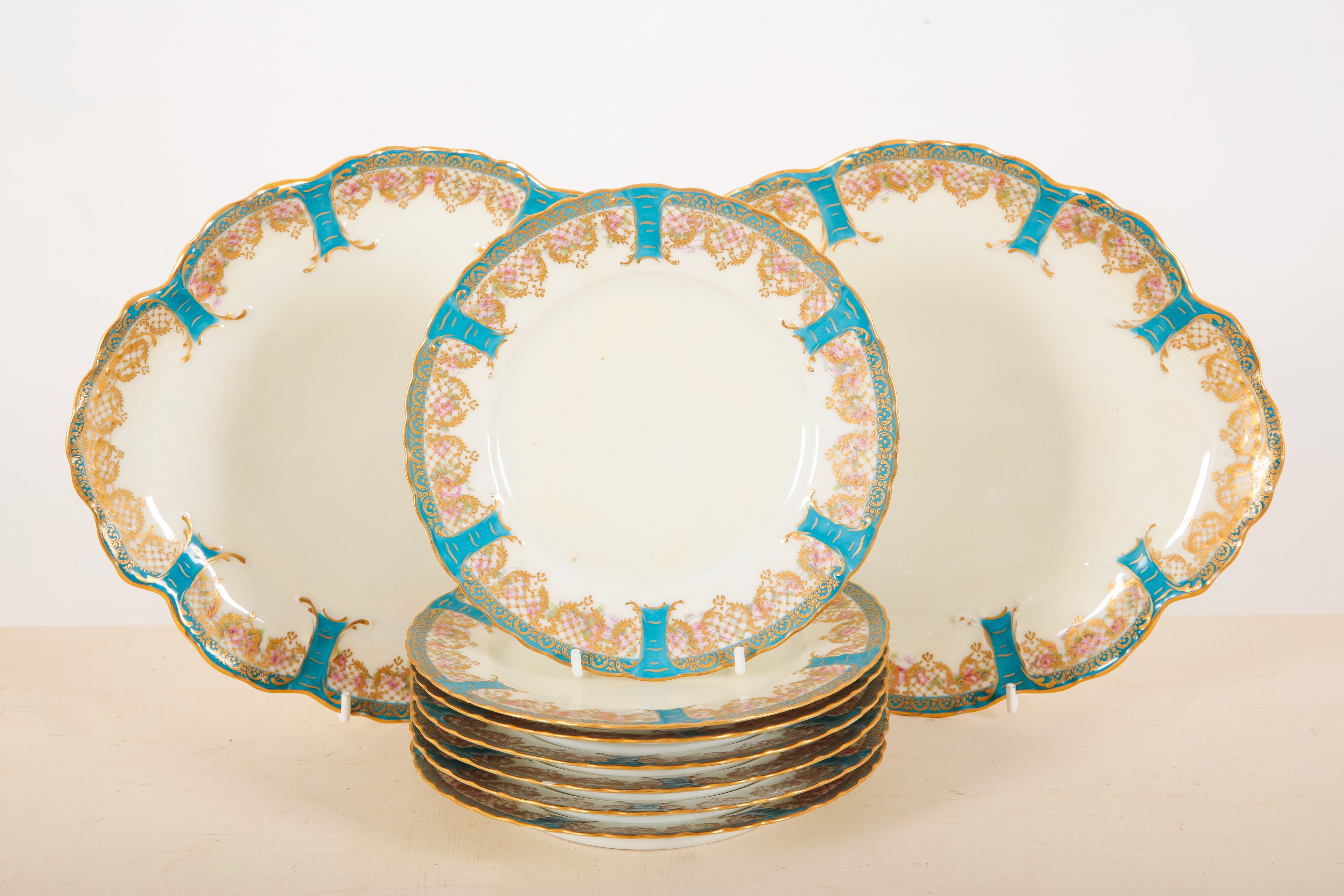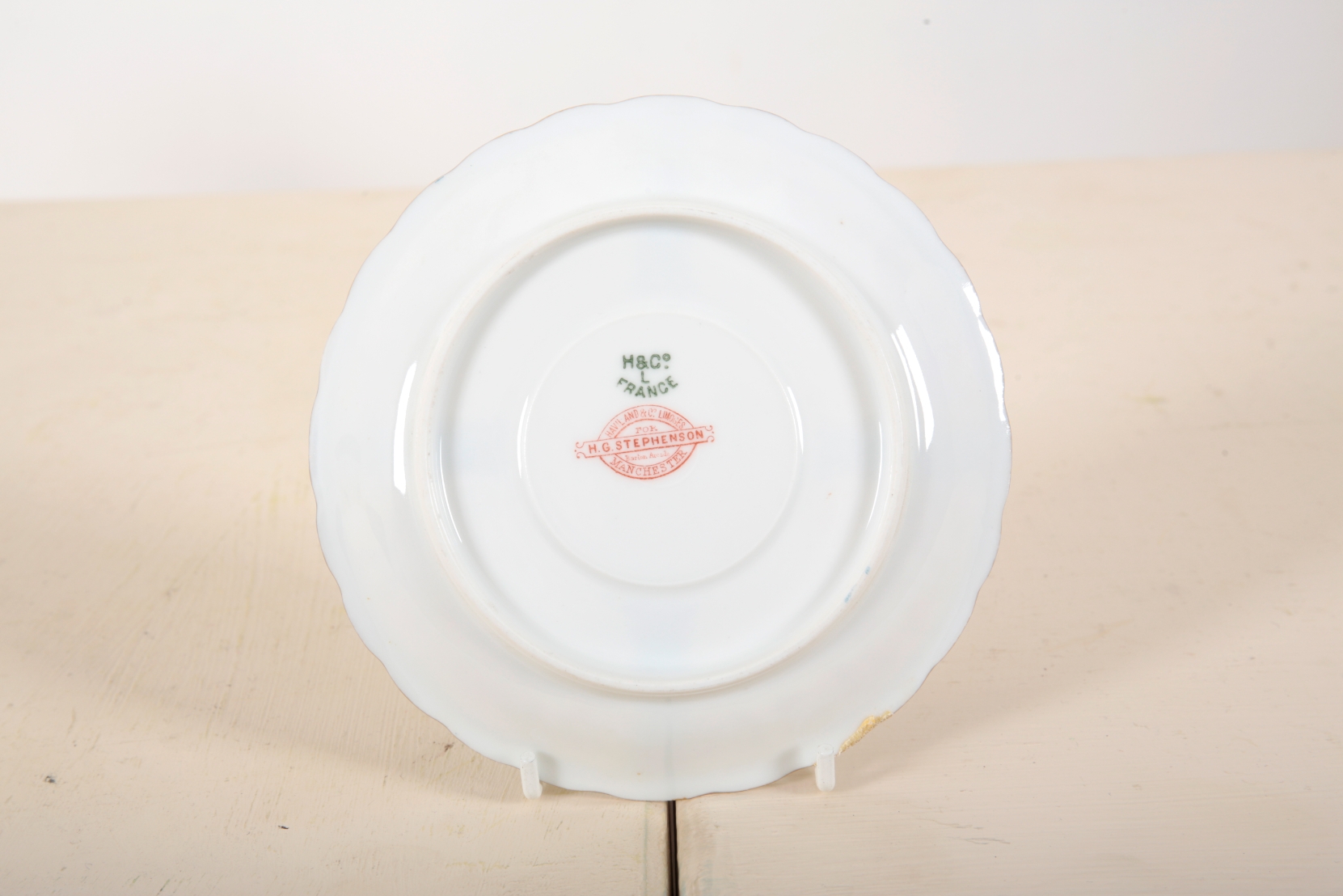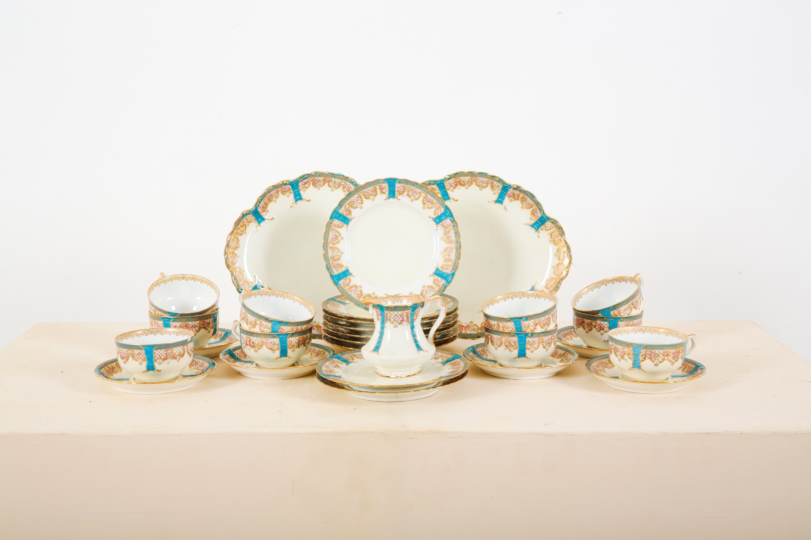 19th/20th century, stamped 'H&Co.L.FRANCE' and 'H.G.STEPHENSON', decorated with turquoise and gilt rim, comprising ten teacups, nine saucers, one jug, and two ovoid plates, 27cm x 22cm (22)
