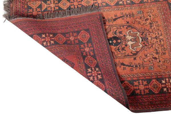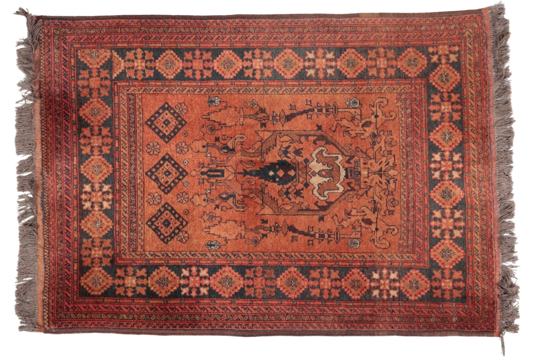 the dark orange ground with central geometric motif highlighted in black, with black geometric conforming borders 147cm x 104cm