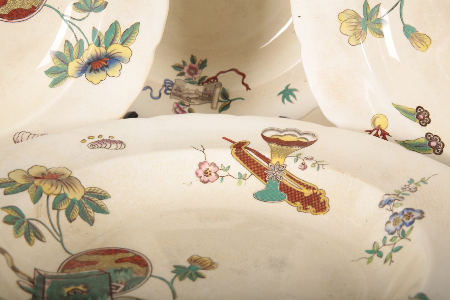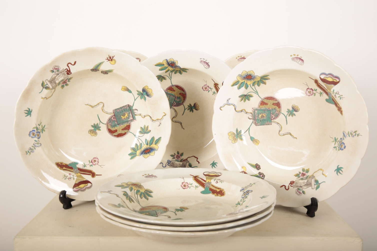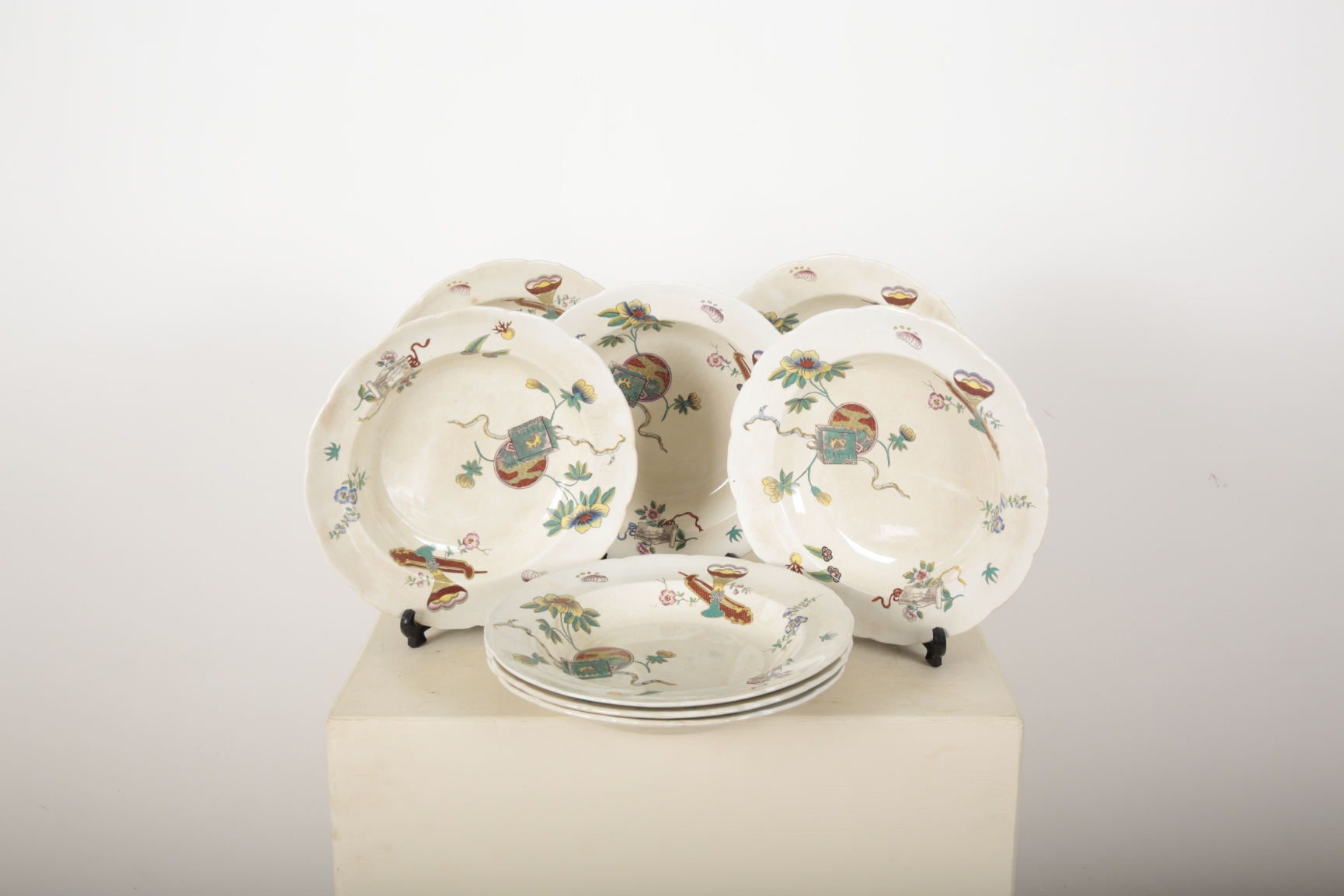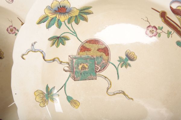 impressed and stamped marks to reverse, decorated with polychrome Buddhistic symbols, 26cm diameter (7)