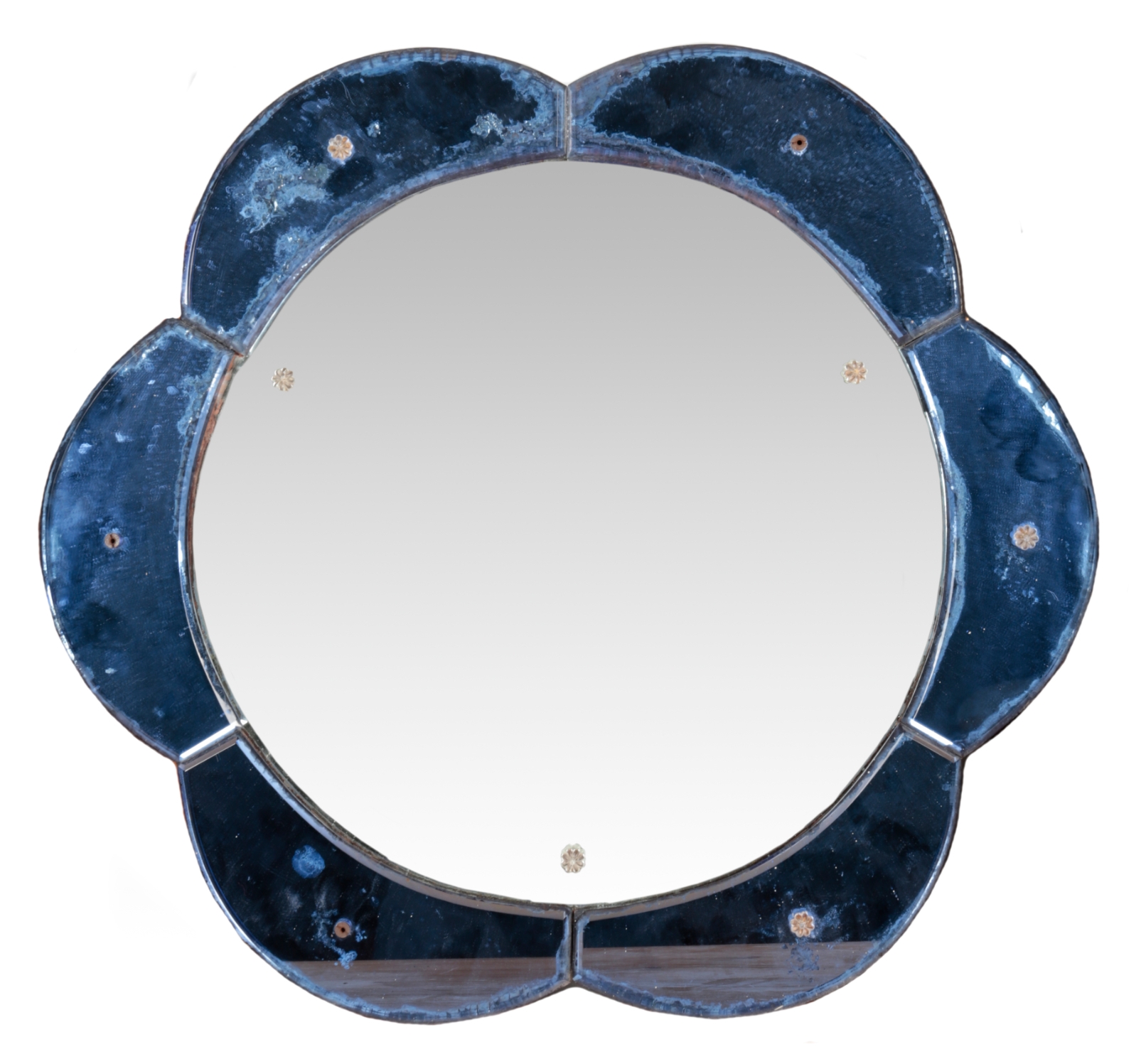 This lot has numerous areas where the mastic has bled through to the glass and left black marks. This is commensurate with age and found on many mirrors of the period.