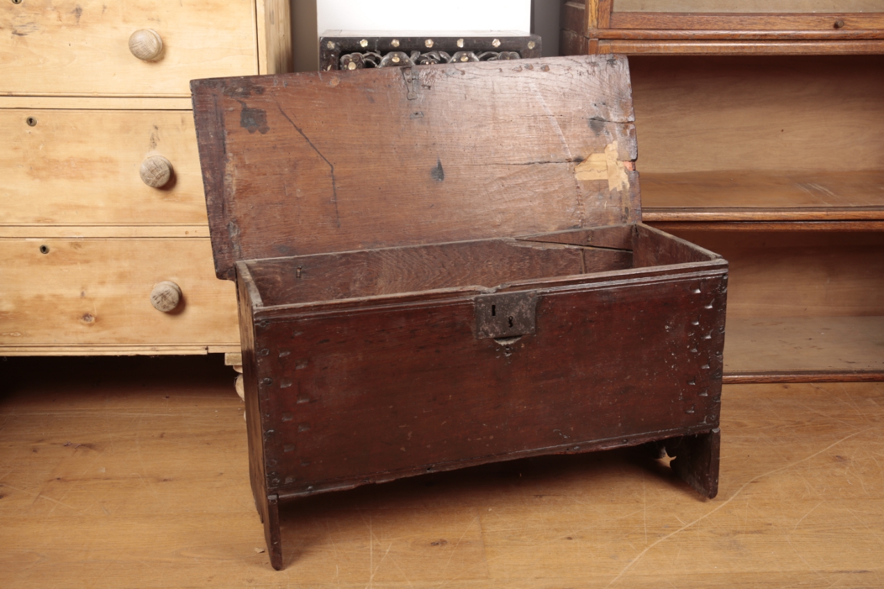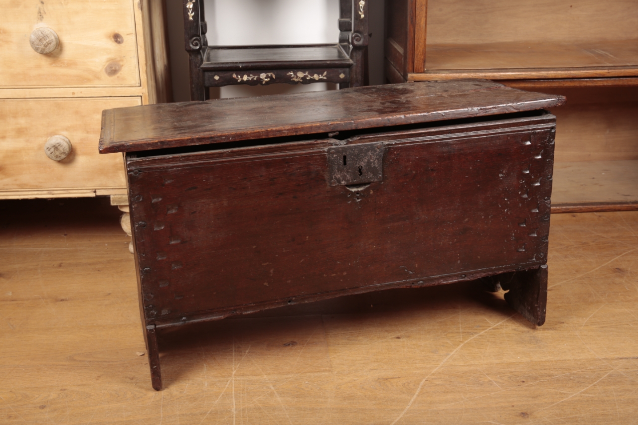 A 17TH CENTURY OAK PLANK COFFER OF SMALL PROPORTIONS
