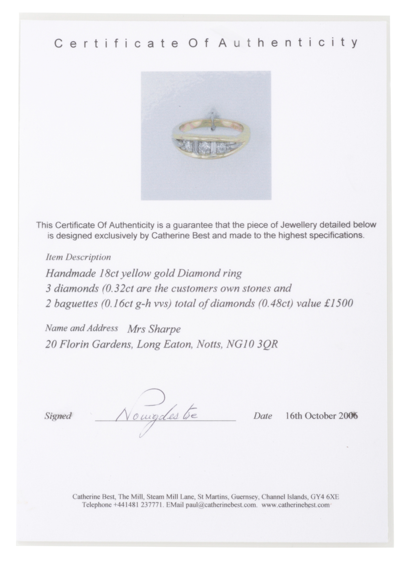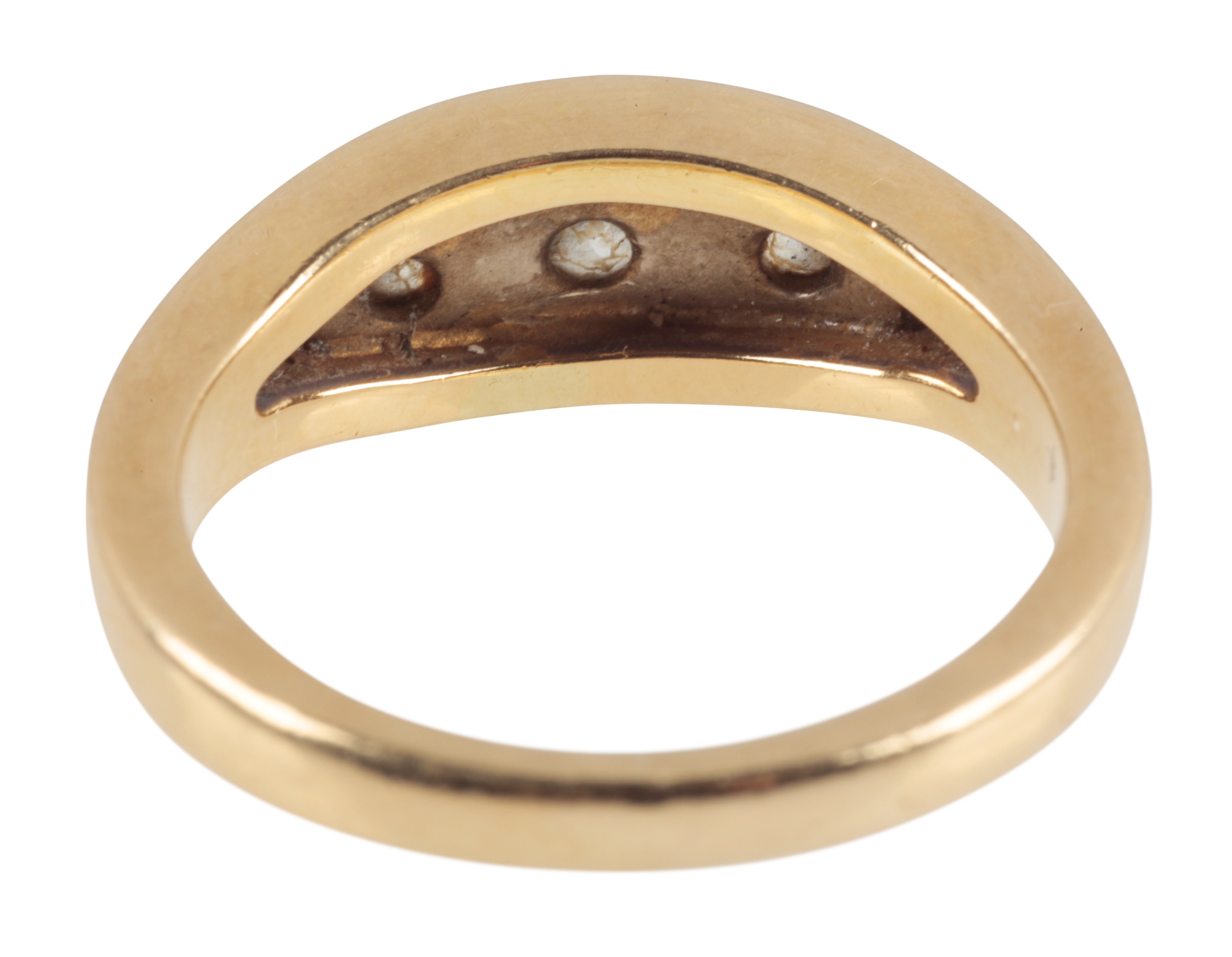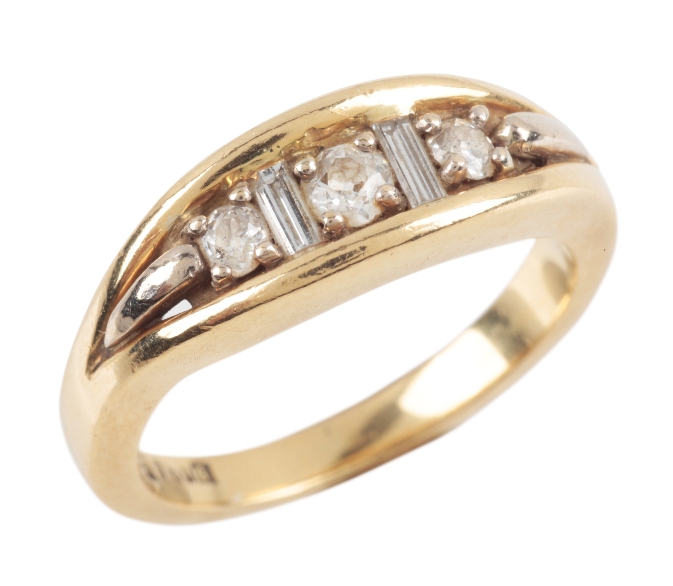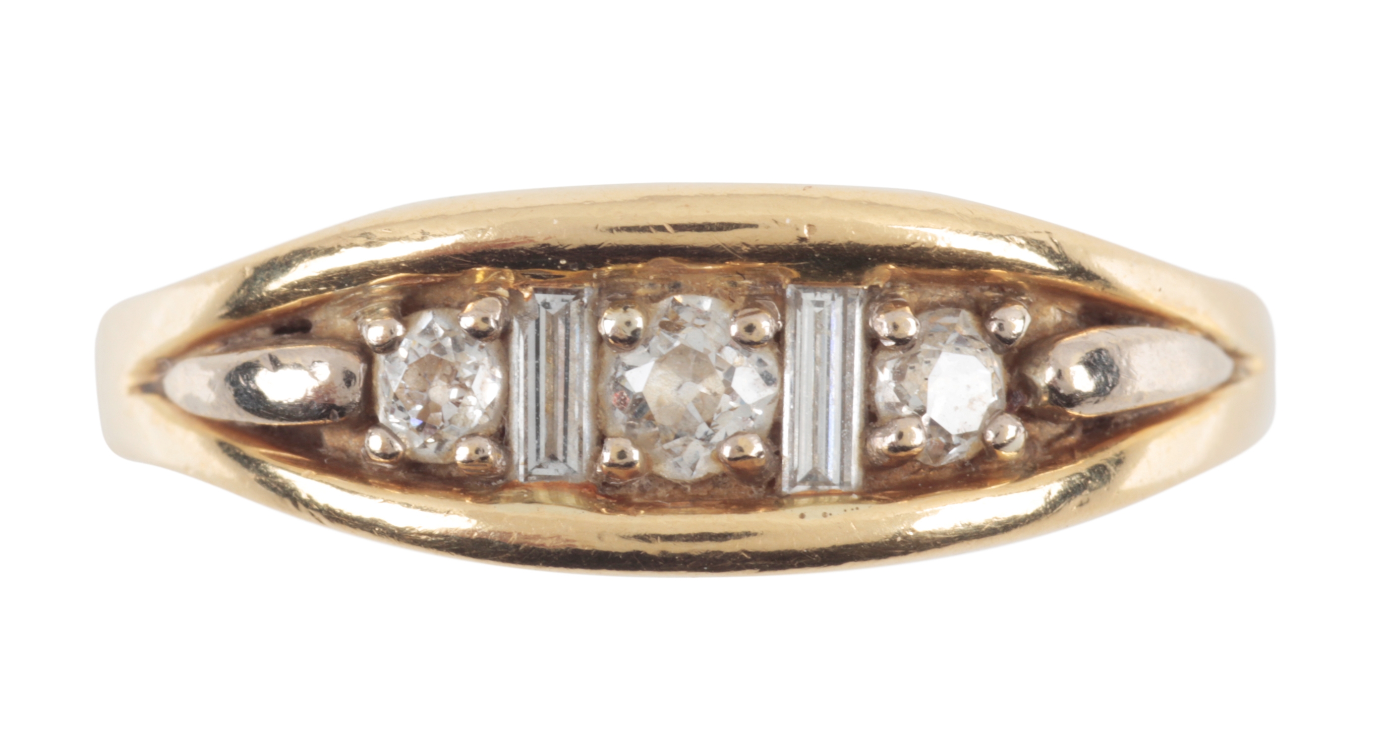 the three round-cut diamonds interspersed with two baguette cut diamonds, c. 0.48 carat total diamond weight, rub-over set to an 18ct gold band, ring size Q, c. 8.13 grams