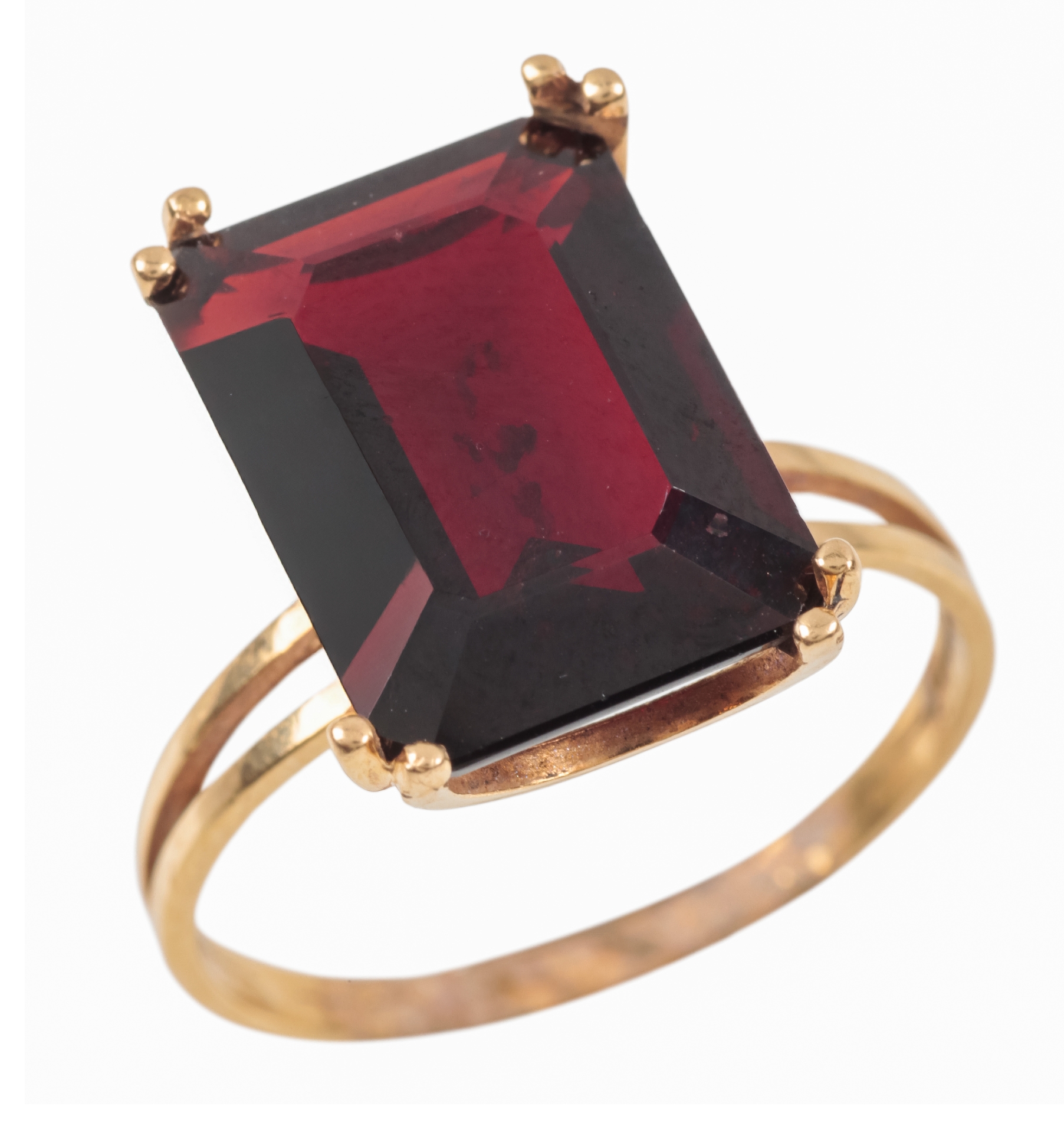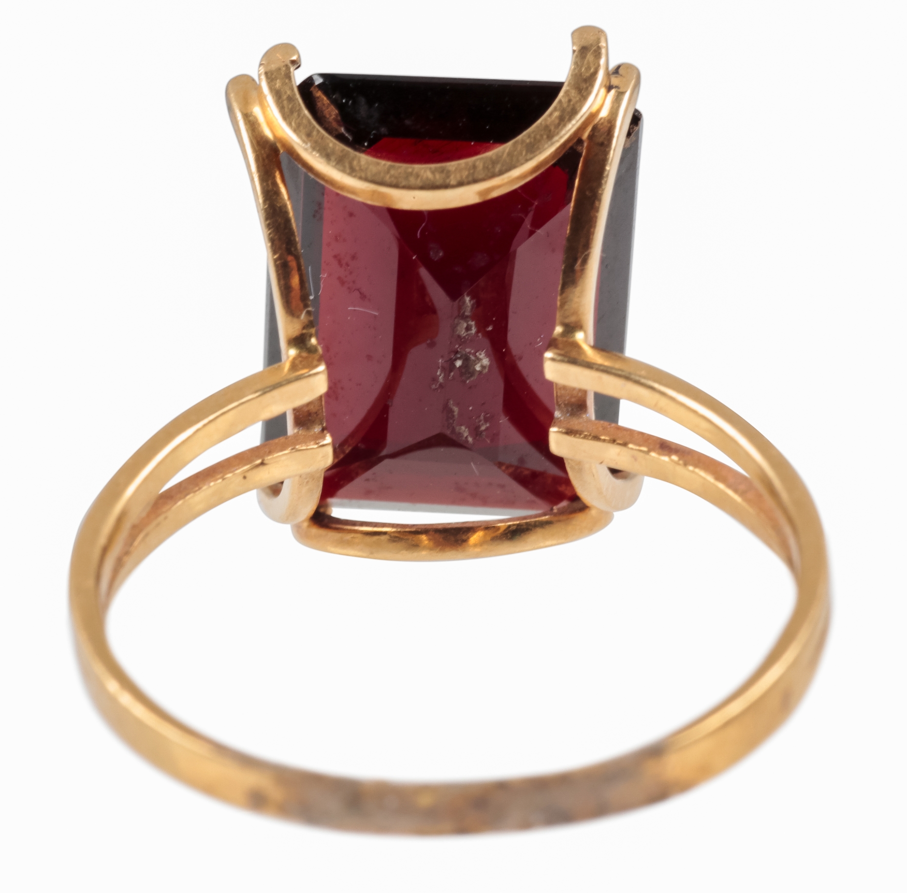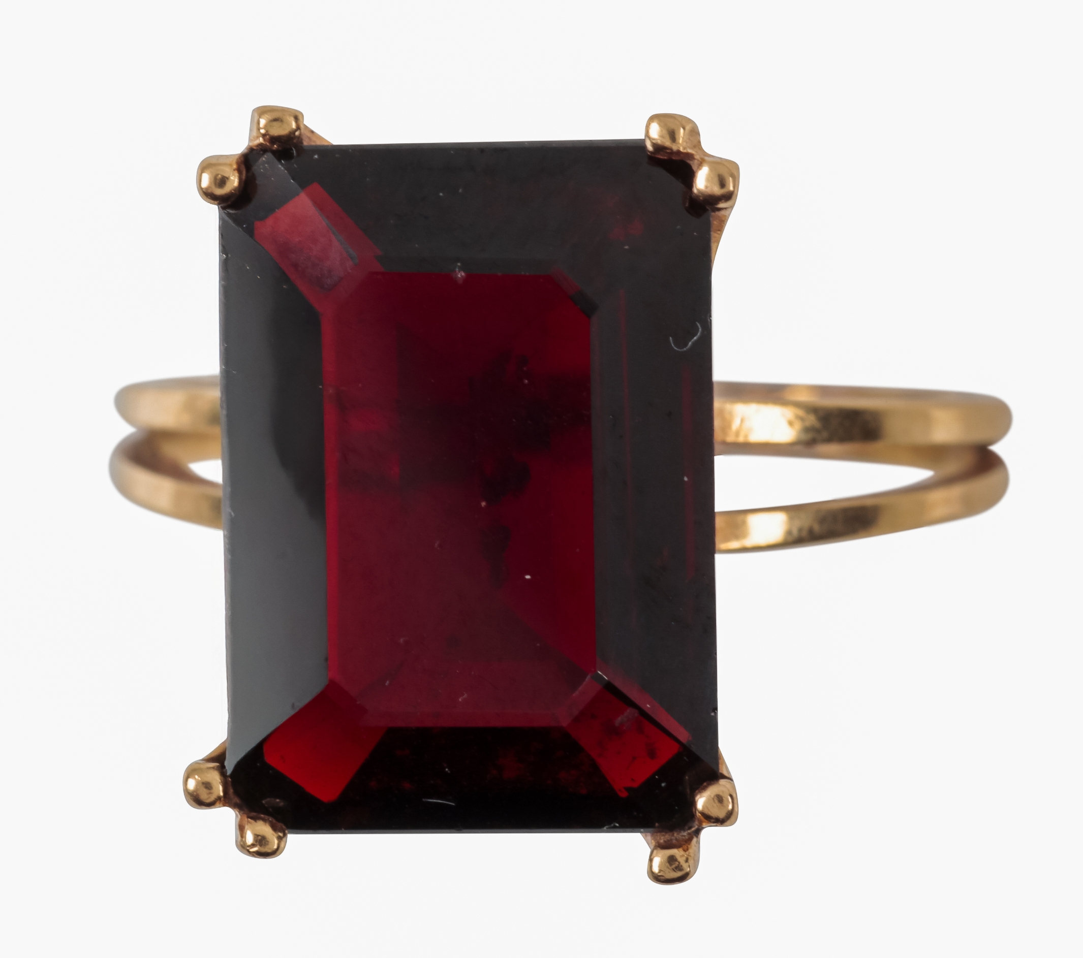the emerald cut garnet c. 14mm x 10mm x 5mm, in unmarked yellow metal setting and shank, surface testing as 14 carat, ring size O, 3.4 grams gross weight