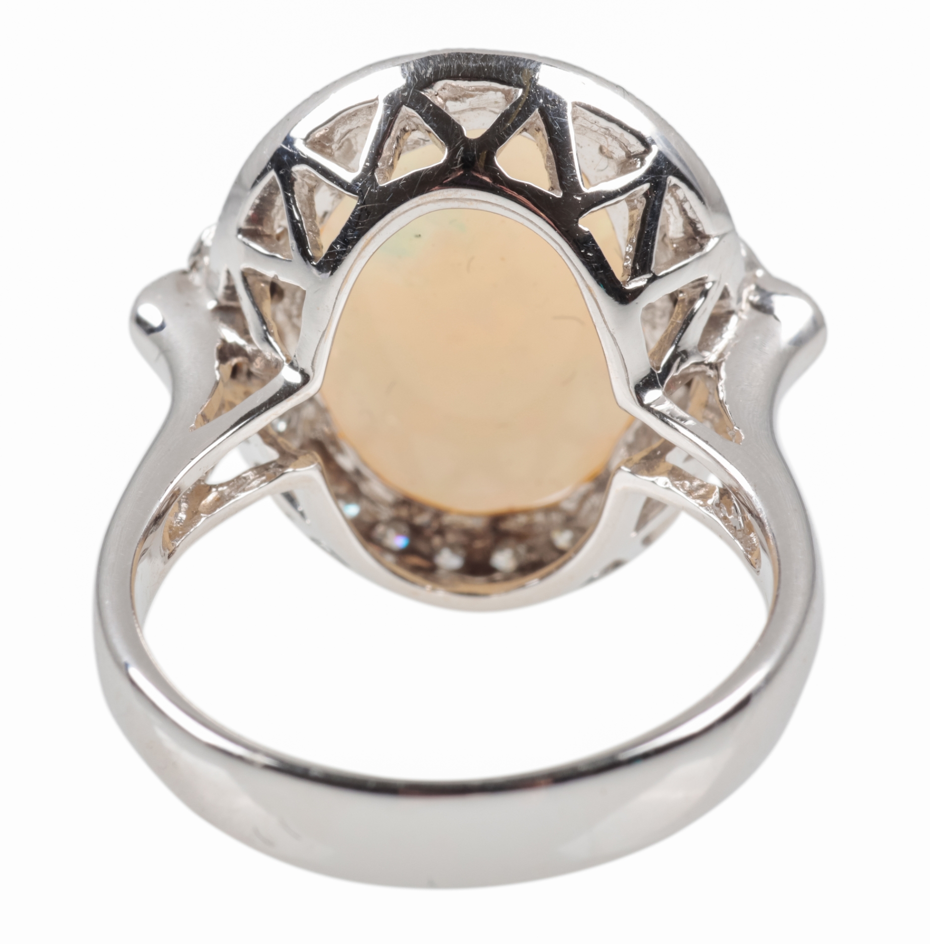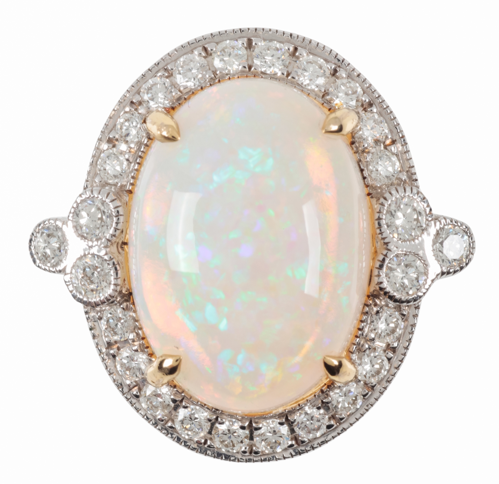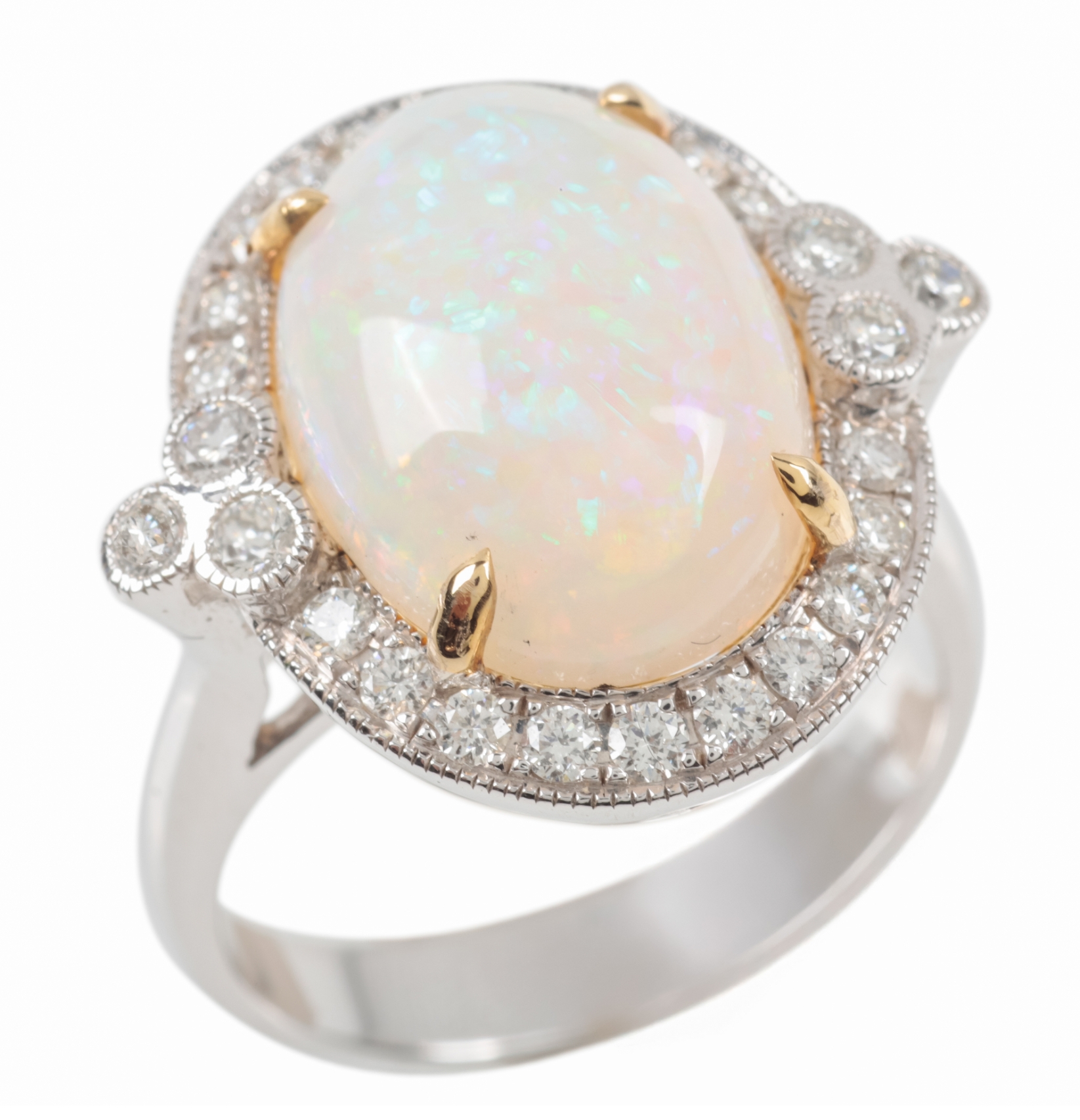 the cabochon opal, c. 5.22 carats, surrounded by round brilliant cut diamonds, c. 0.53 carats combined, in 18ct yellow and white, the shank stamped 750, ring size N, c. 7.5 grams