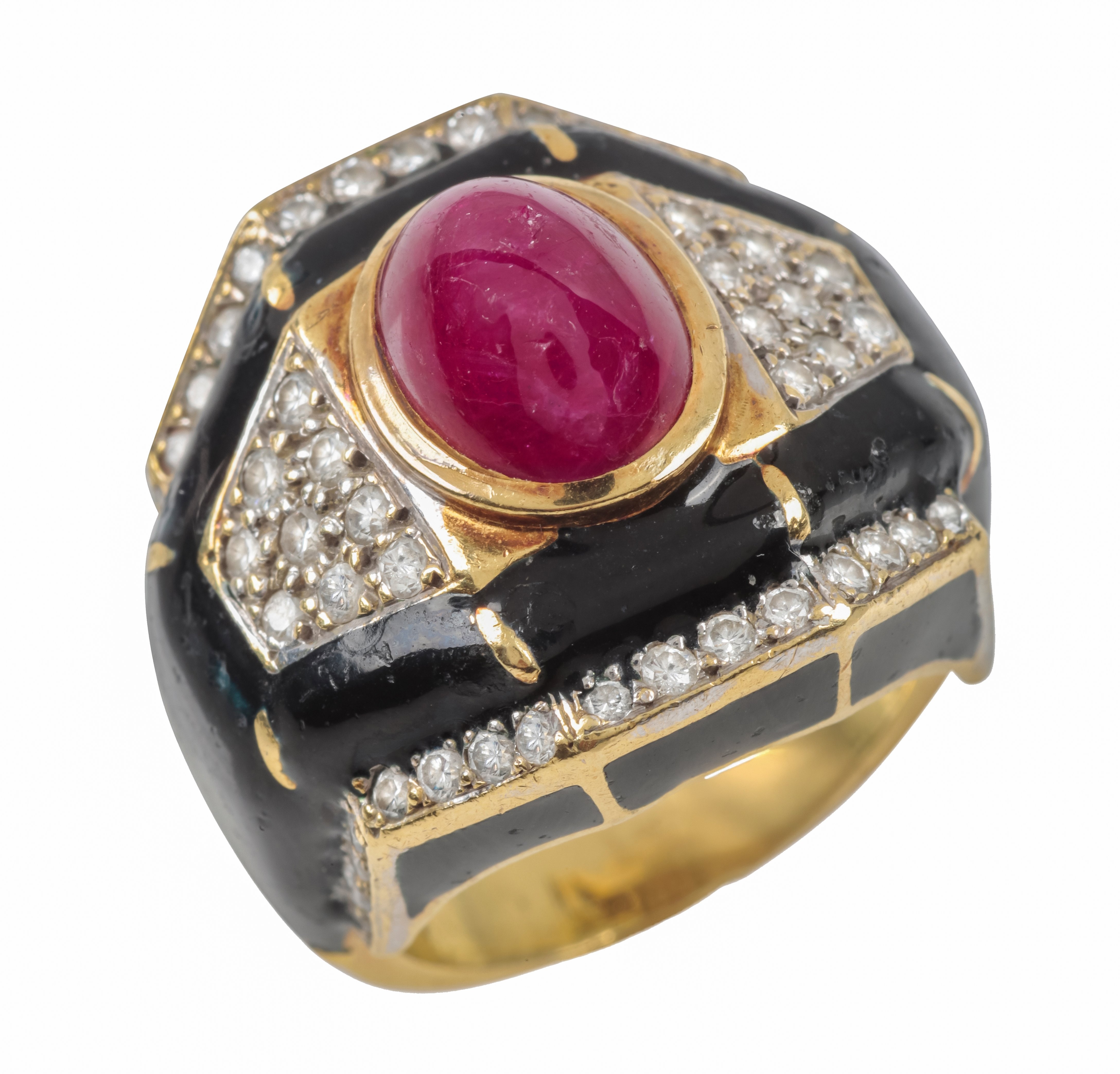 set with a cabochon ruby c. 10.01mm x 7.01mm x 8mm, with pave set diamonds and black enamel bands, the shank stamped 18K, ring size N, c. 20.8 grams gross weight