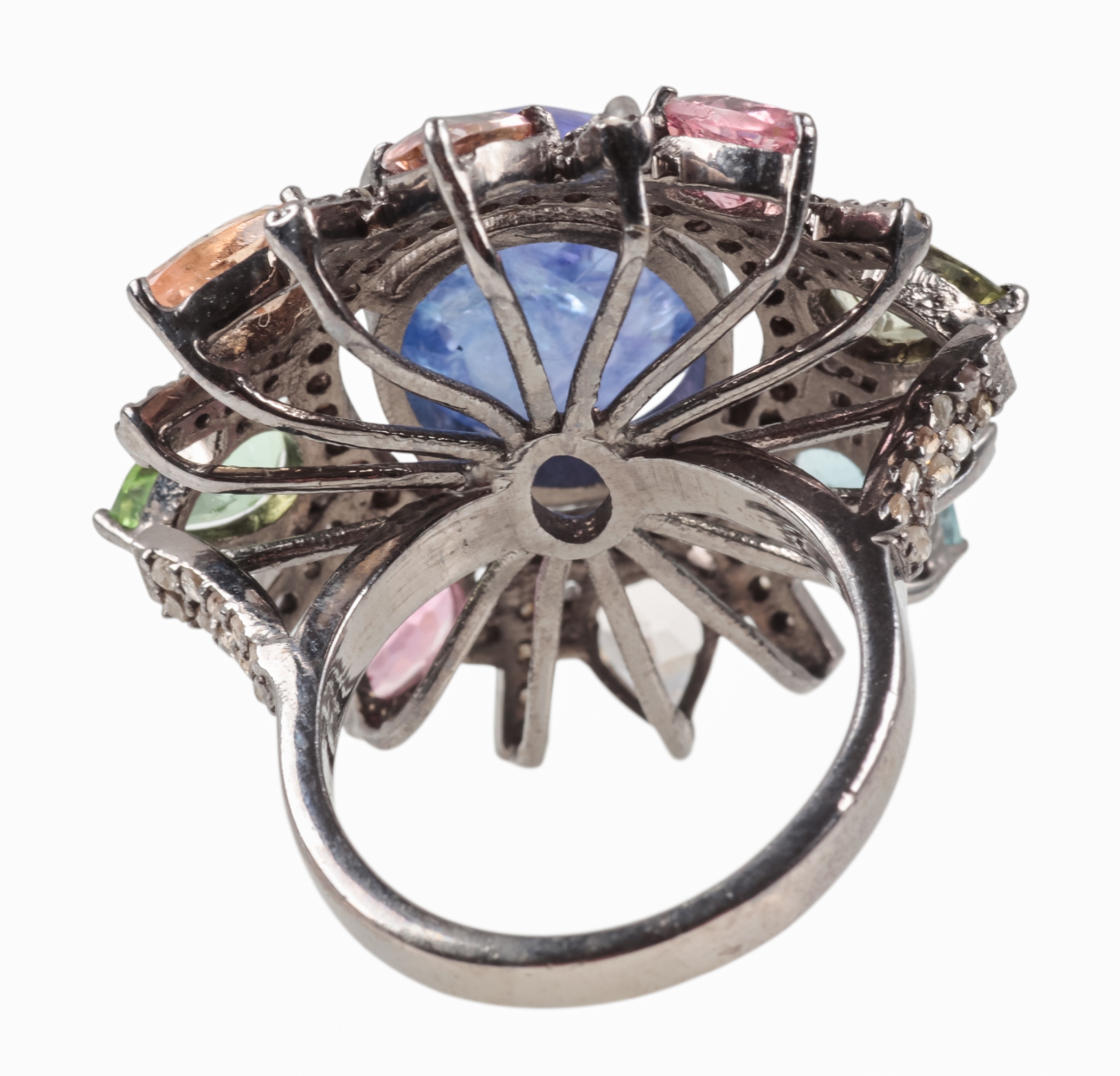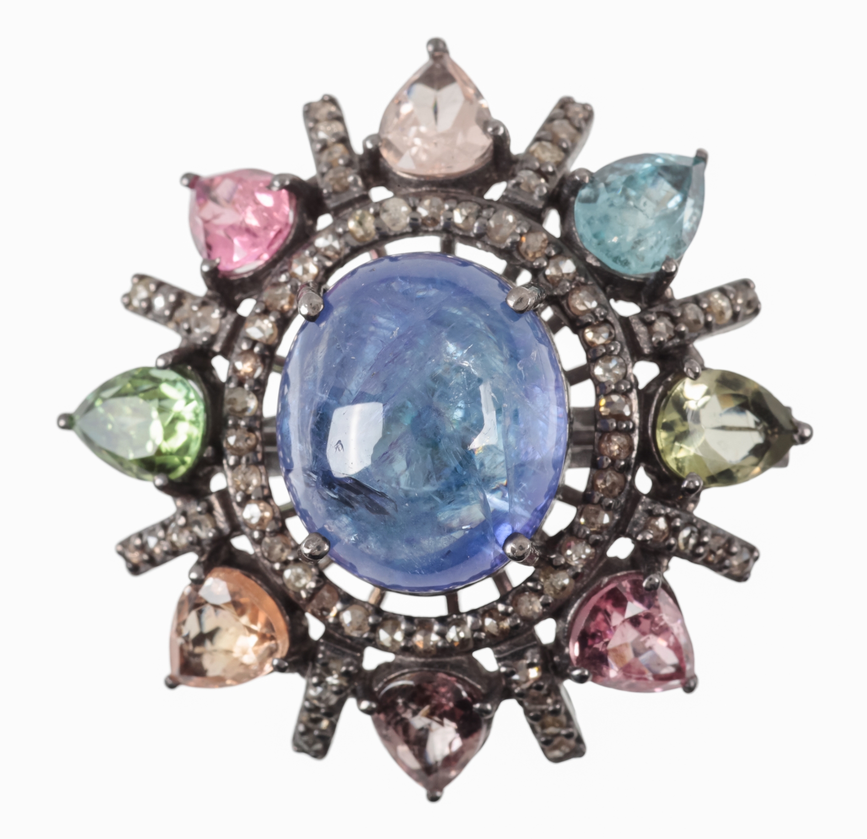 the tourmaline c. 7.33 carats, the kyanite c. 3.09 carats, and the diamonds c. 0.36 carats combined, the shank stamped 925, ring size O, c. 13.3 grams