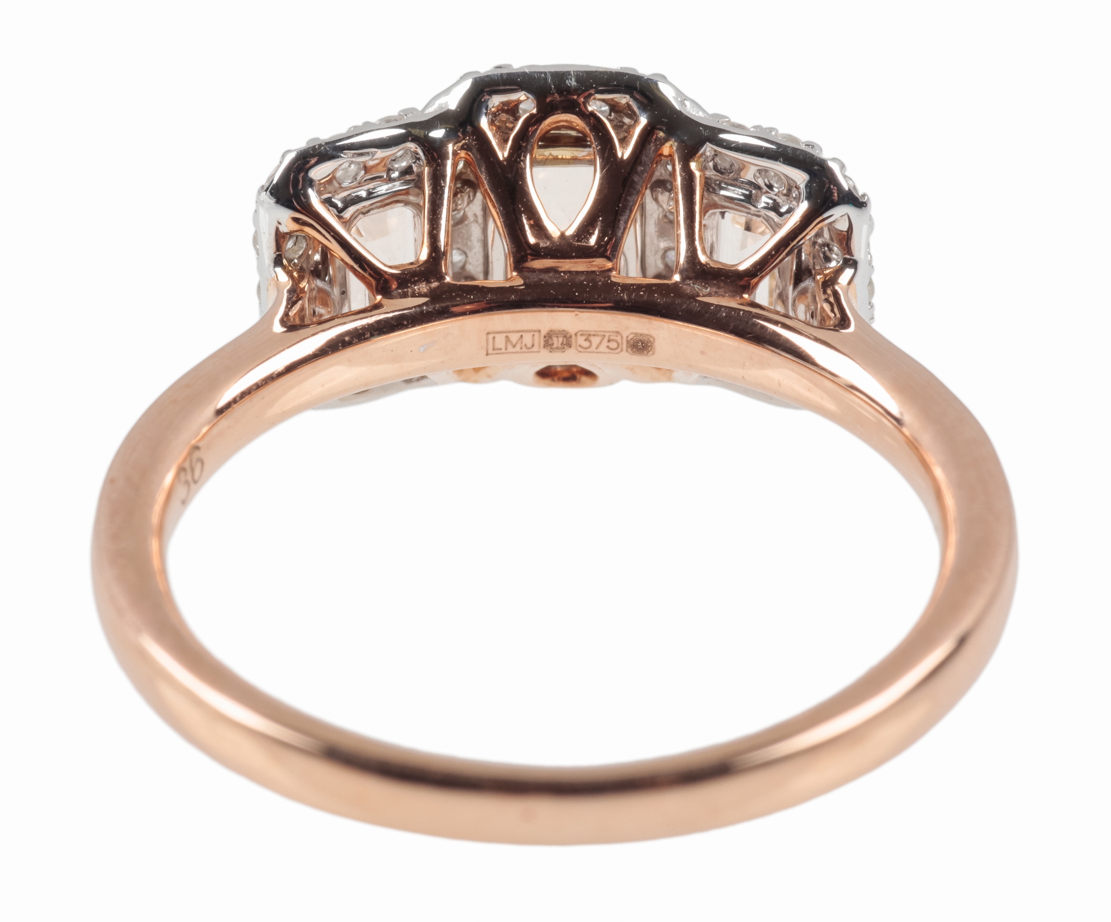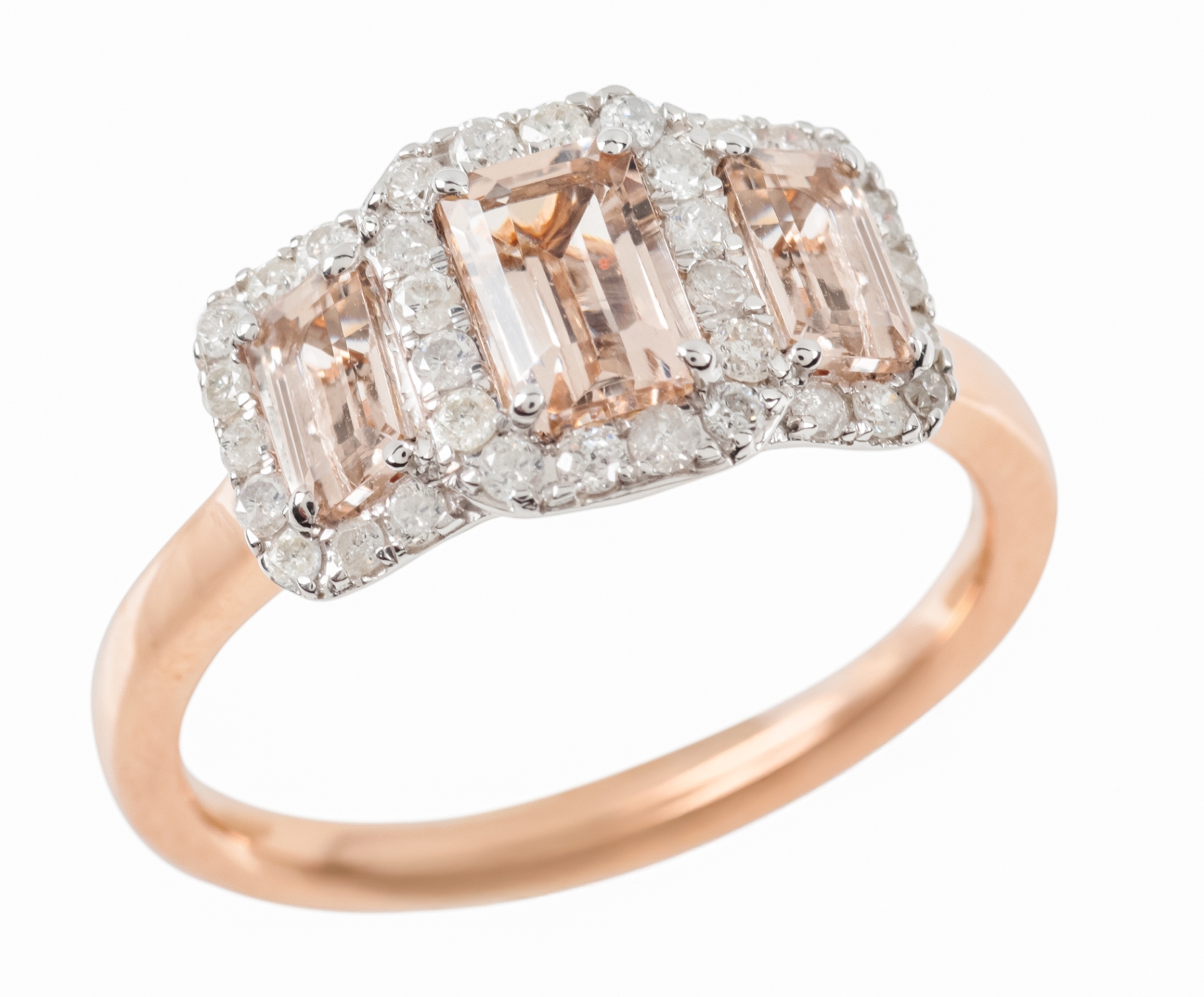 the graduated set cut morganite, c. 1.22 carats, with round brilliant cut diamond surrounds, c. 0.34 carats combined, the shank stamped 9K, ring size O, c. 3.6 grams
