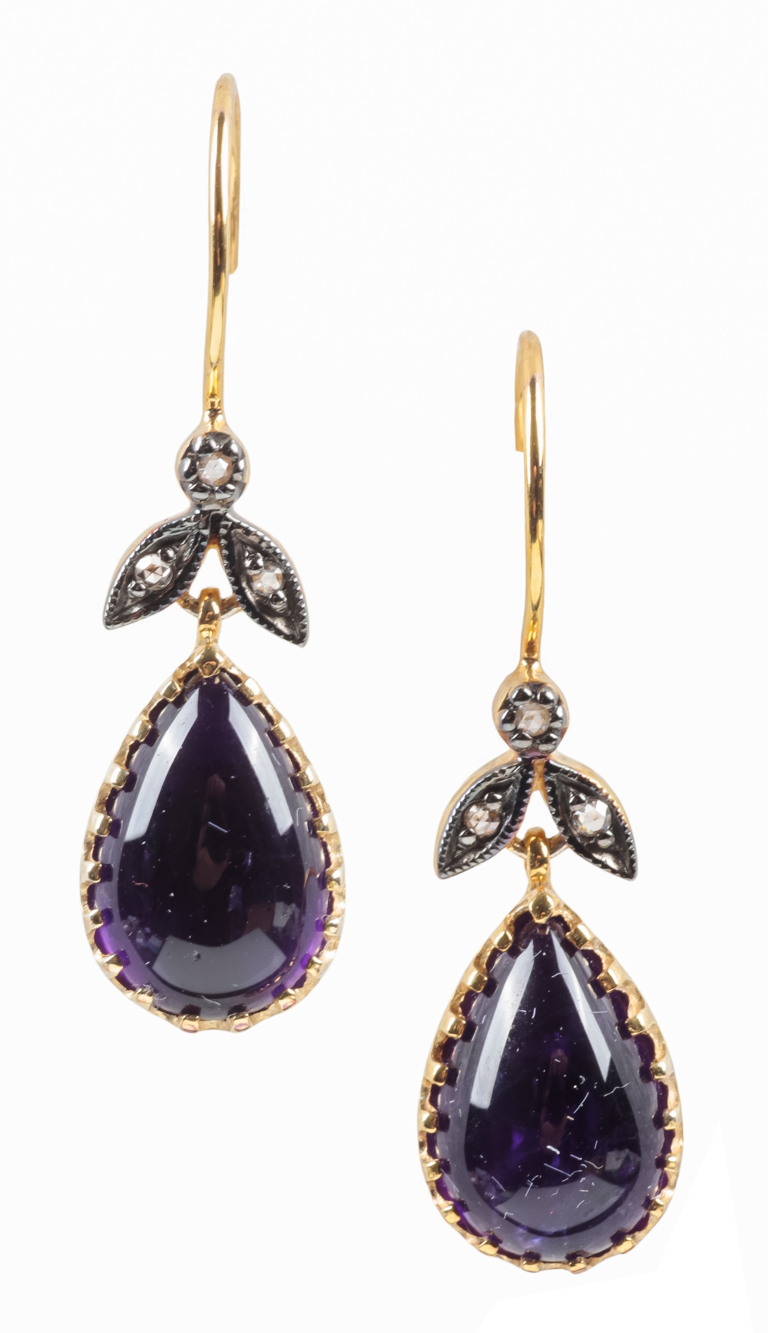 the cabochon pear shaped amethyst c. 4.00 carats combined, with diamond set bales, c. 0.06 carats, with fish hook backs, stamped 375 and 925, drop c. 31mm, c. 5.2 grams, boxed